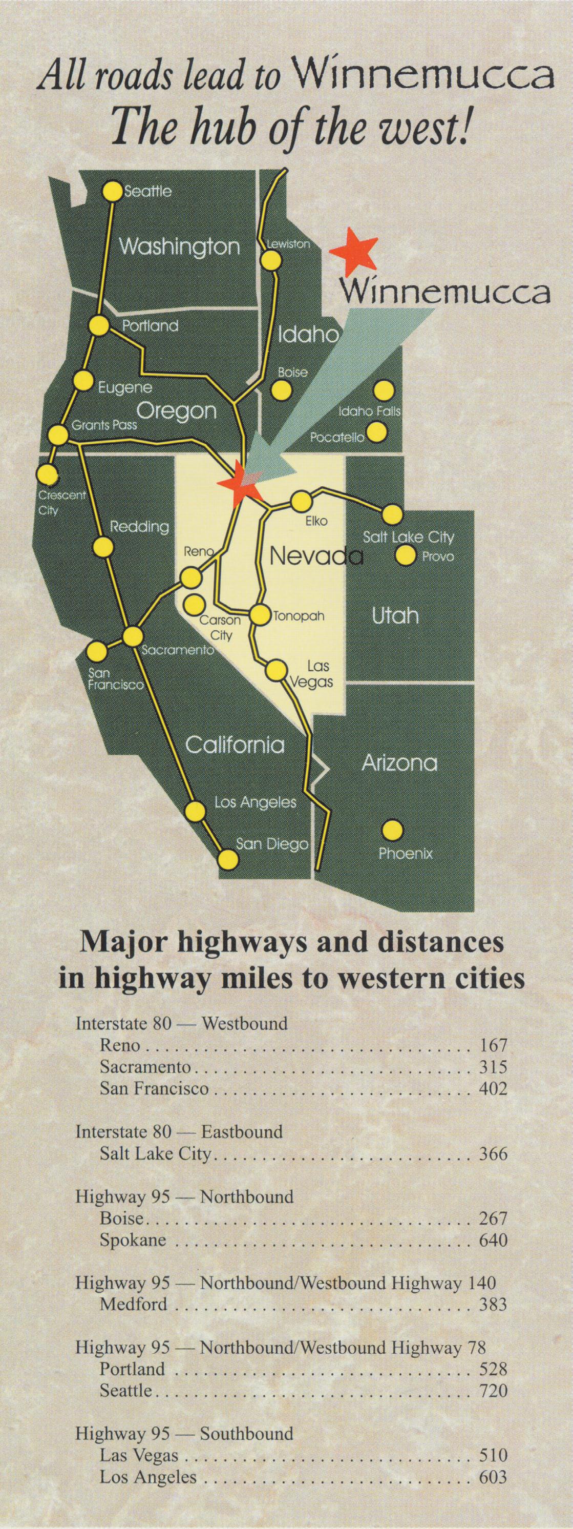 Winnemucca is located 167 miles east of Reno and 265 miles southwest of Boise, Idaho.