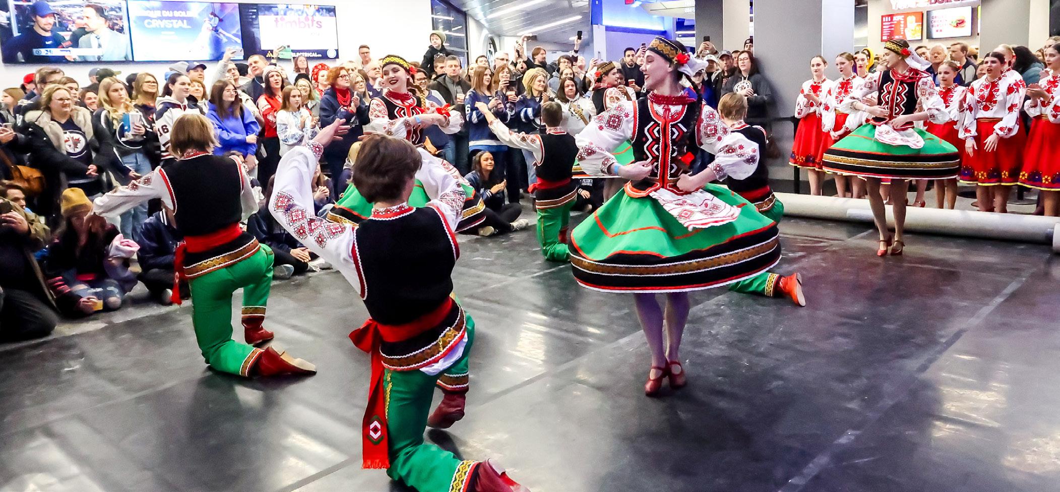 At the game, Troyanda Ukrainian Dance Ensemble and its Tsvit dancers, accordion player Nancy Sedo, and local Ukrainian band Zrada contributed to the showcase of Ukrainian culture while Hoosli Ukrainian Male Chorus sang the anthems. Ukrainian Canadian Congress Manitoba, Manitoba Parents for Ukrainian Education and Jets alumnus Dave Babych and brother Wayne Babych, who both work with Canadian Friends of Hockey in Ukraine, were recognized for their positive impact on the Ukrainian community. Canada Life Centre’s culinary team partnered with Mashyn Family Food, operated by recent Ukrainian Canadian newcomers, to serve homemade perogies, meat varenyky, and honey cake.