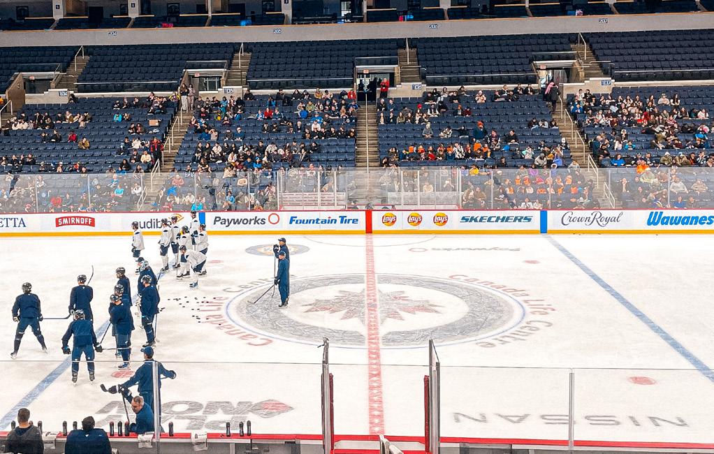 Serving and retired Canadian Armed Forces members practiced their hockey skills and scrimmaged with Jets Alumni and Friends at hockey for all centre, highlighting the strong connection between our armed forces and the hockey community.