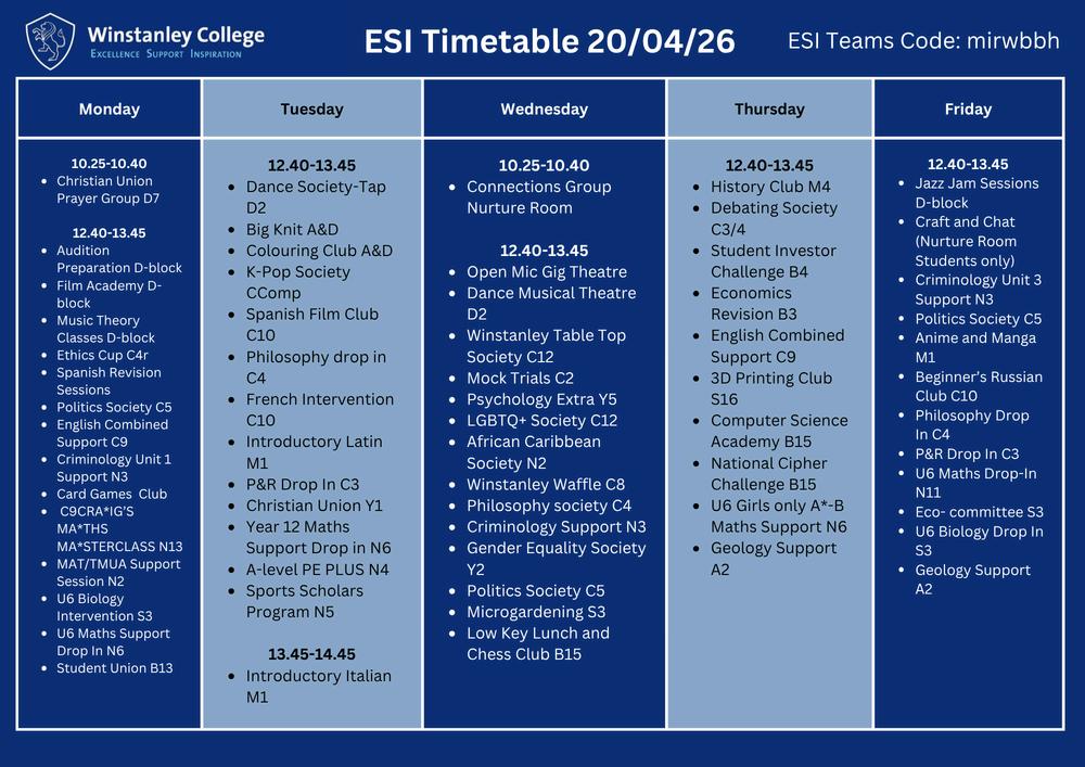 The ESI timetable for the first week back after Easter is shown below Students are reminded that the College recommends completing 40 hours of ESI activities each year, and using free time during the College day is a very good way of working towards this