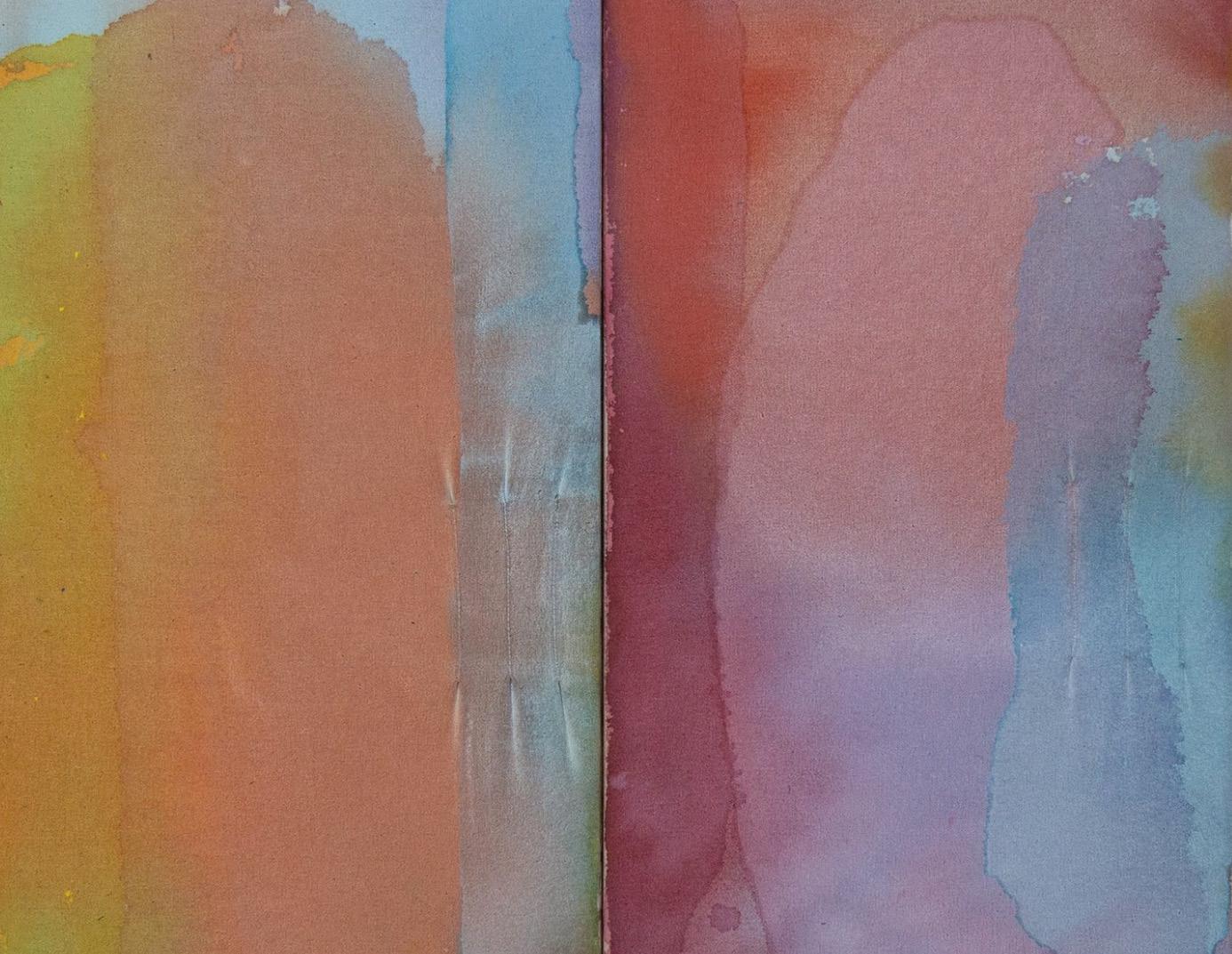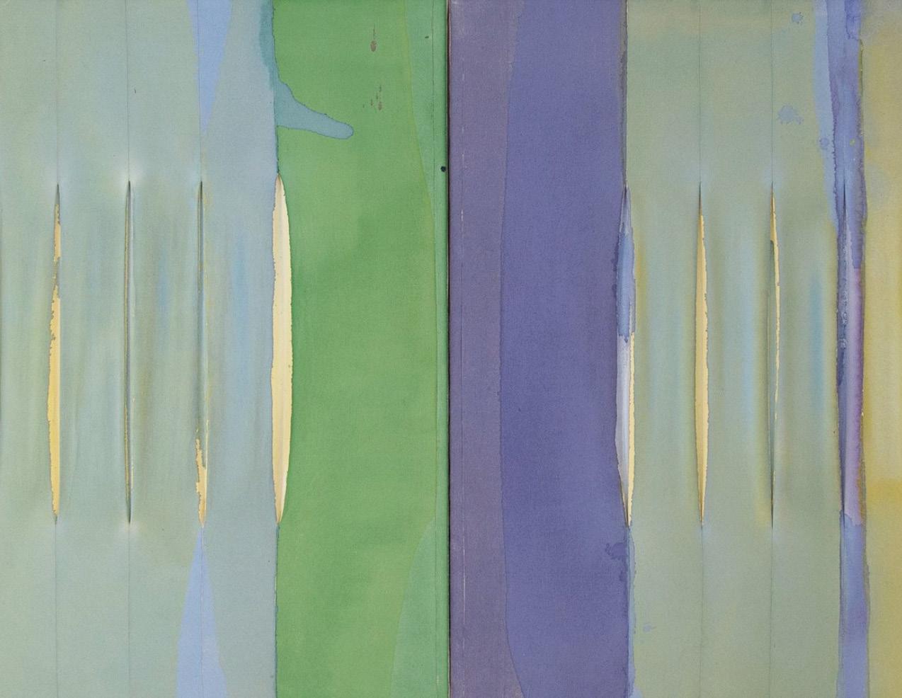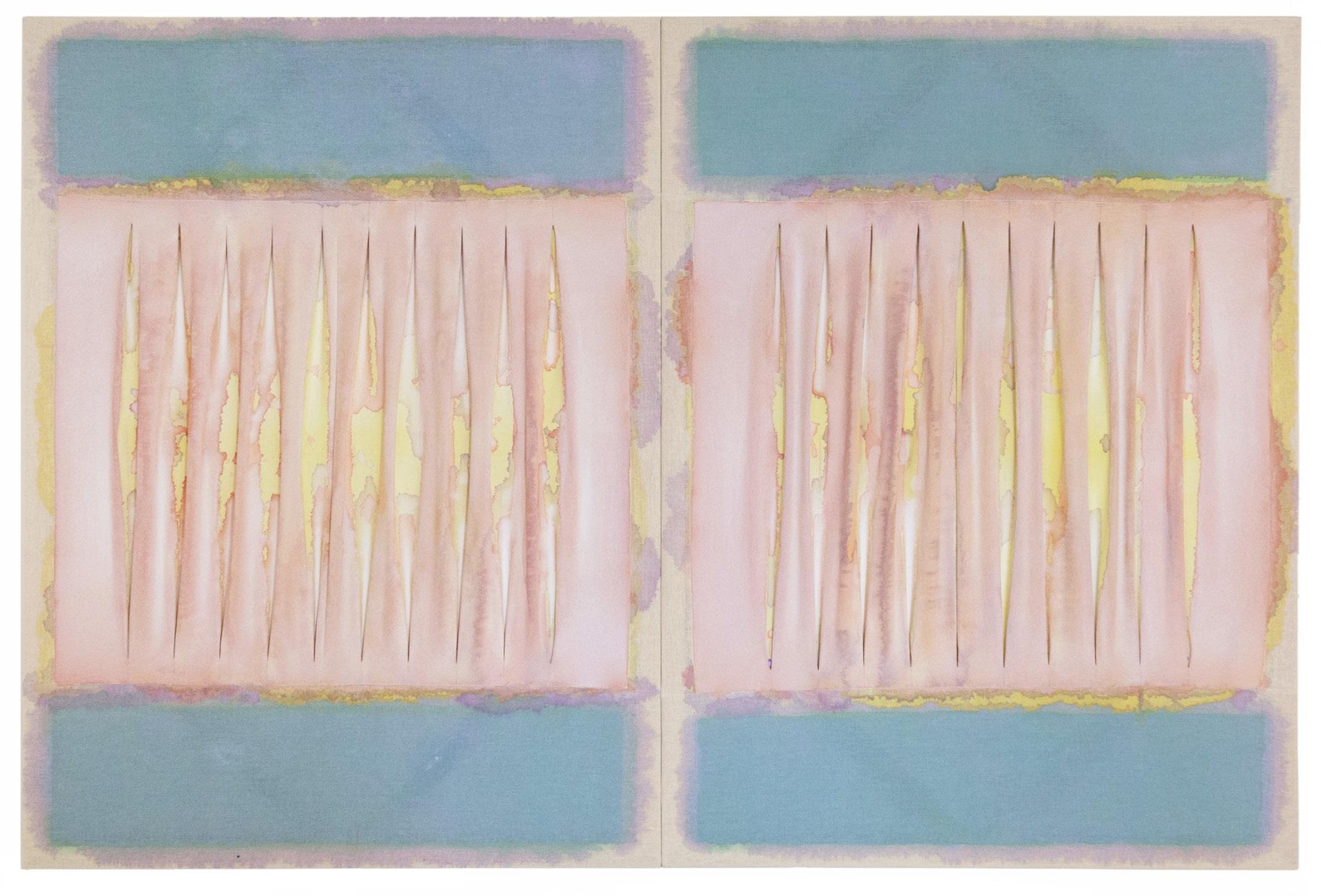Diluted acrylic paints stain raw fabric. The liquid runs over the loosely stretched Kwangmok (Korean muslin) and Sambe (Korean linen), staining where the fabrics have been cut open on the surface. As the pigment dries, the fabrics become tighter around the stretchers. This physical interaction between materials during the painting process is a critical aspect of Park’s practice. Traditionally, Kwangmok was used for garments or covering a body for burial. Sambe was used for summer garments or household items due to its porous quality. These materials naturally resemble skin and are designed to be an extension of the body. Park utilises these fabrics for this reason, bringing a sense of kinship into the work.