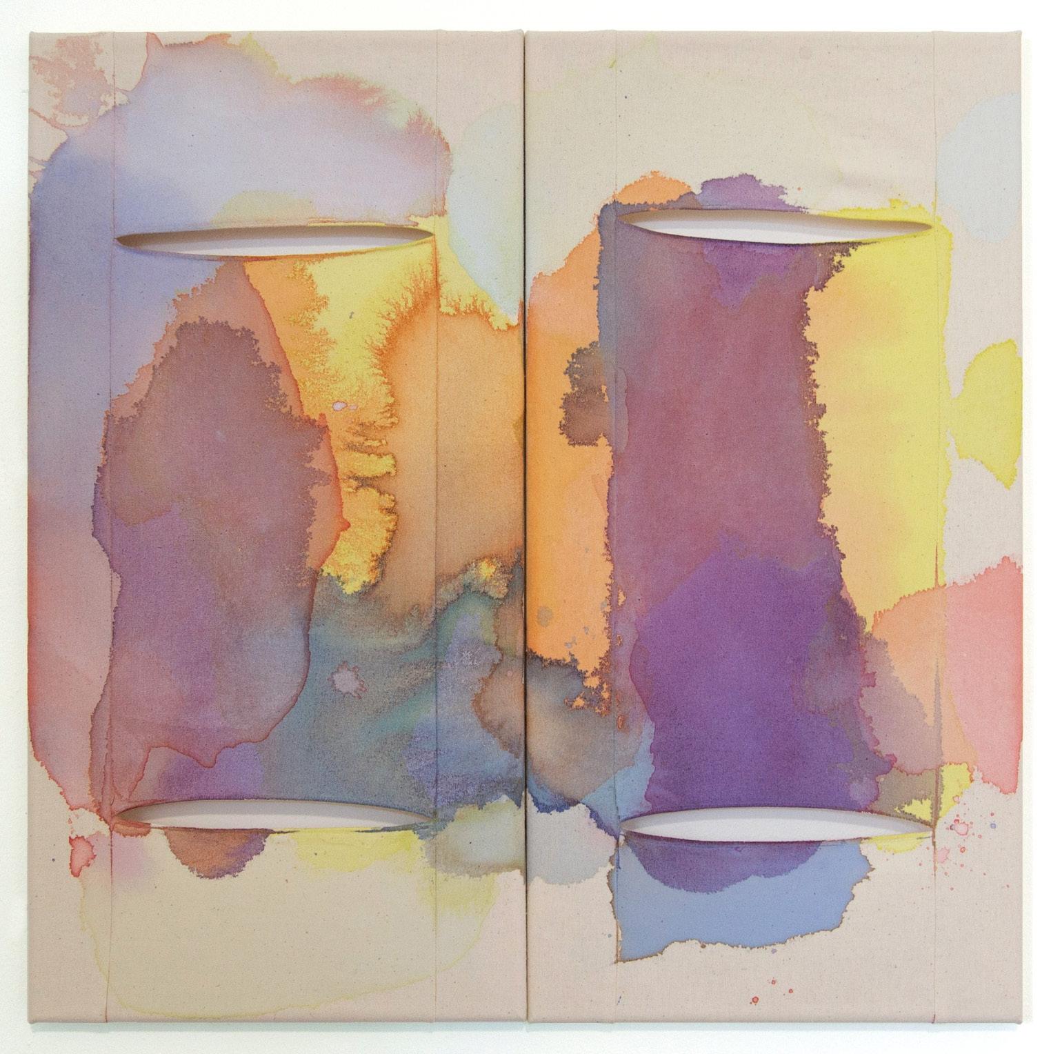 For Park, A four-walled space and painting share the same principle: the space within a square. Painting has the potential to go beyond a flat surface while maintaining the shape of the square. Park constructs the surface of each work with openings as if they are pocket holes for pants or shirts. The opening simultaneously exposes the underside of the painted surfaces while its own shadow is cast on the wall behind, like a doorway connecting one room to another. In this case, Park’s use of dual panels symbolizes two figures. Two seemingly identical individuals in one space evoke the sensation of looking at a mirror.