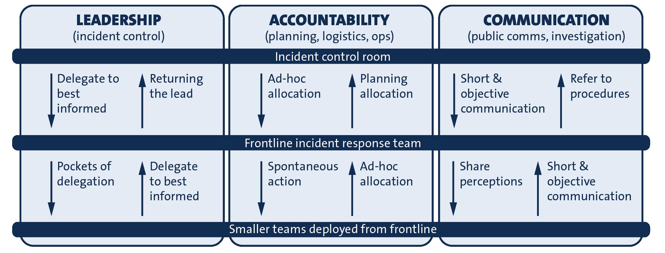 • Planning and execution - This study looked at a planning and execution model for rapid response scenarios. Responders will adapt their hierarchy of control (incident control, frontline, small teams) across three simultaneous activities: leadership, accountability, and communication (Figure 4).