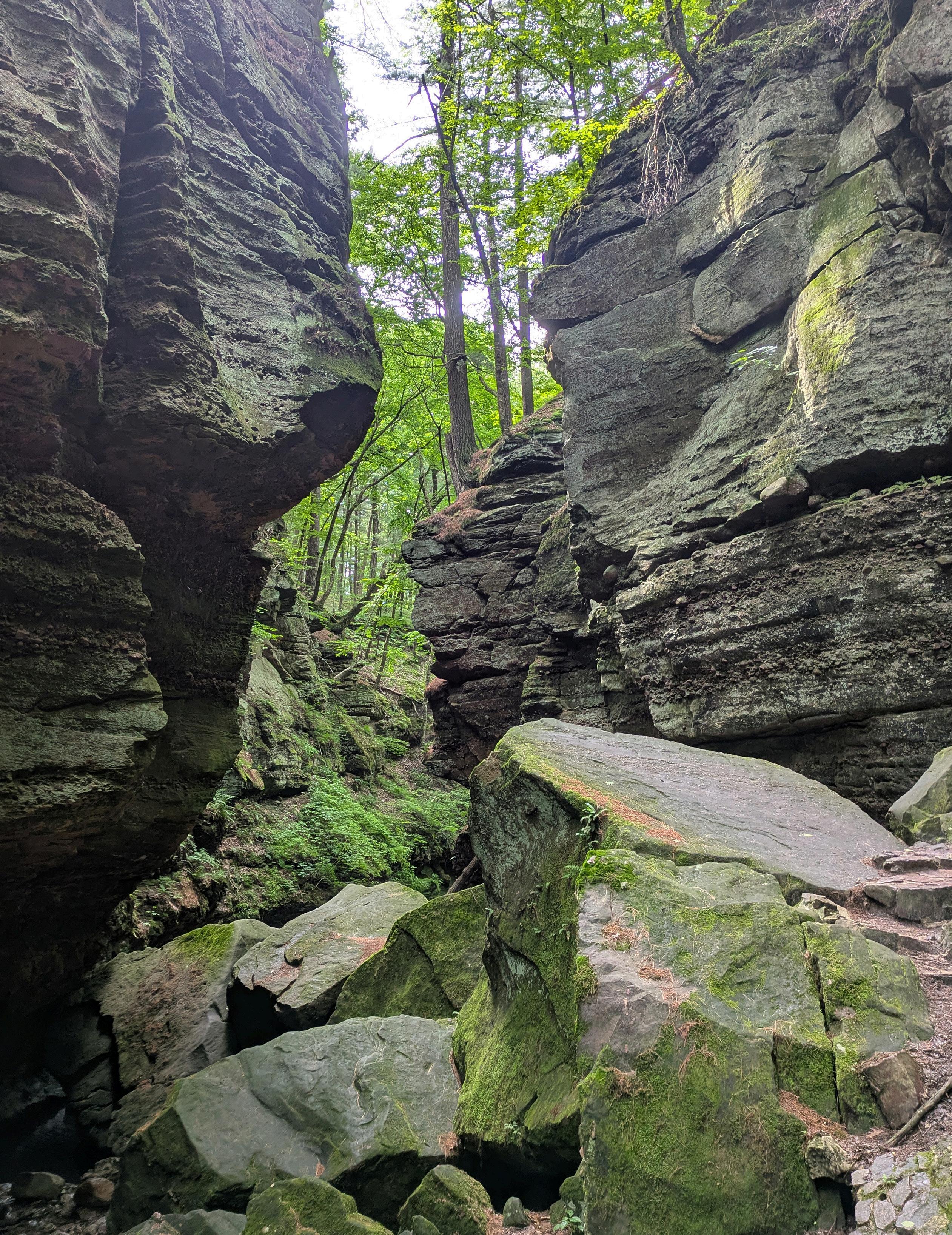 Later, powerful glacial meltwaters bulldozed through the area, creating the gorge and leaving behind a series of potholes formed by the grinding action of swirling sand and gravel. This is an excellent area to observe fracture-controlled stream flow and the development of multiple stream terraces.