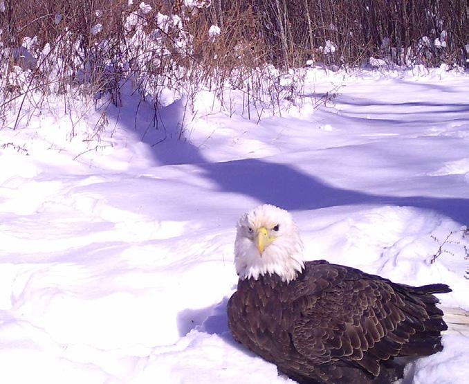 I read in this new (winter) edition the article on bald eagles. That brought to mind a photo taken on my Snapshot Wisconsin camera in Waupaca County, near Iola. This magnificent bird was just sitting in the snow. However, if you look closely, you will notice it is missing an eye. A following photo showed it flying away, seemingly unhampered by this injury.