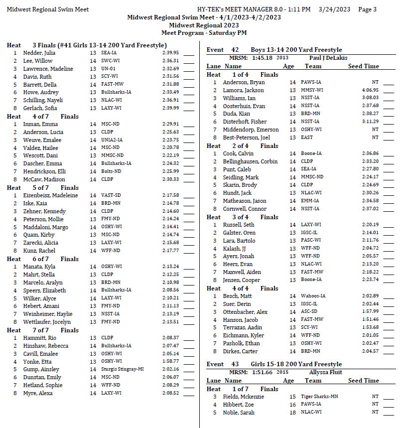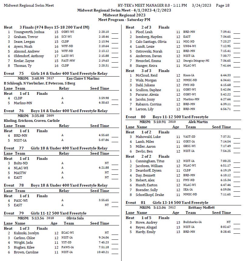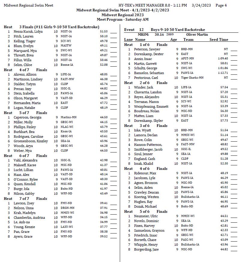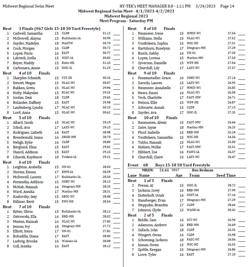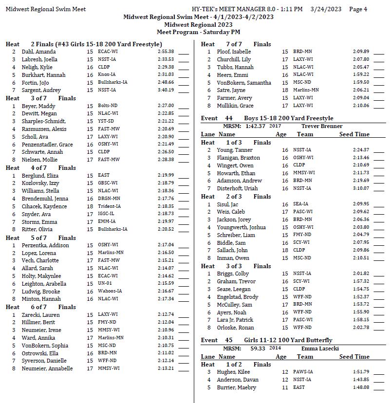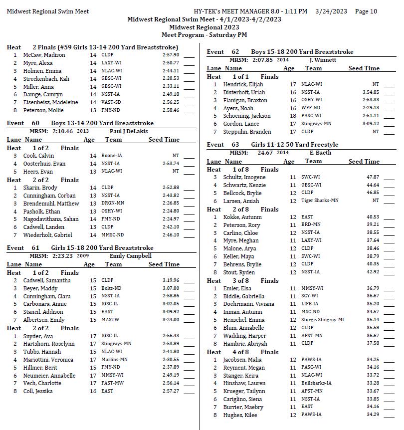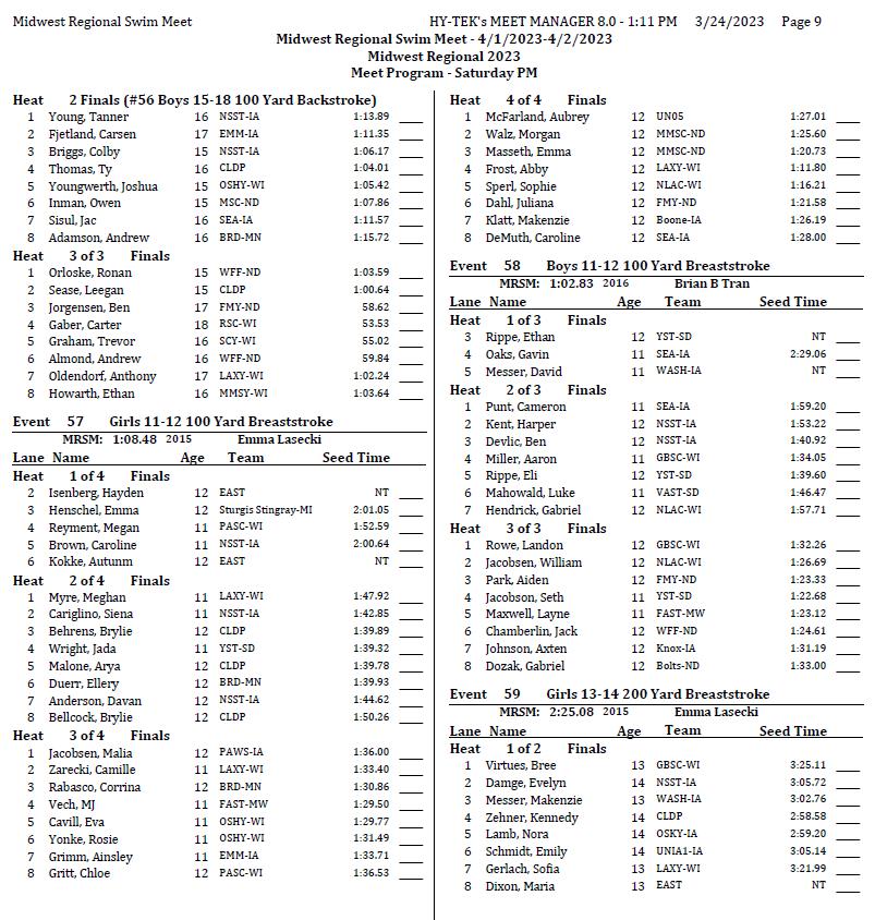 2023 Midwest Regional Swim Meet FULL Schedule - All Sessions