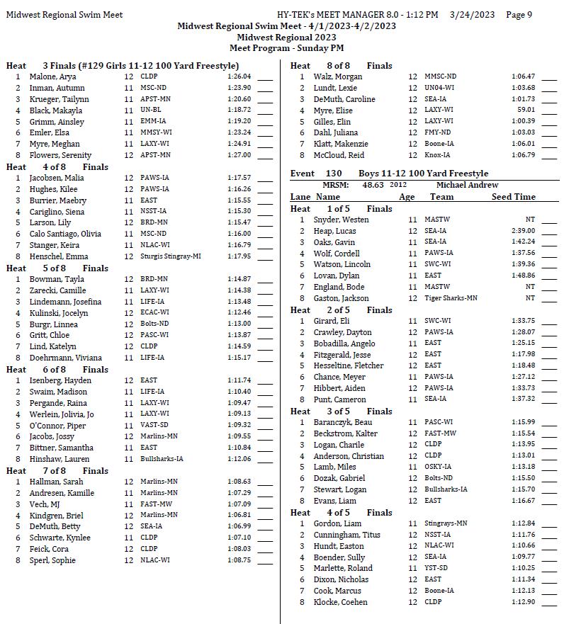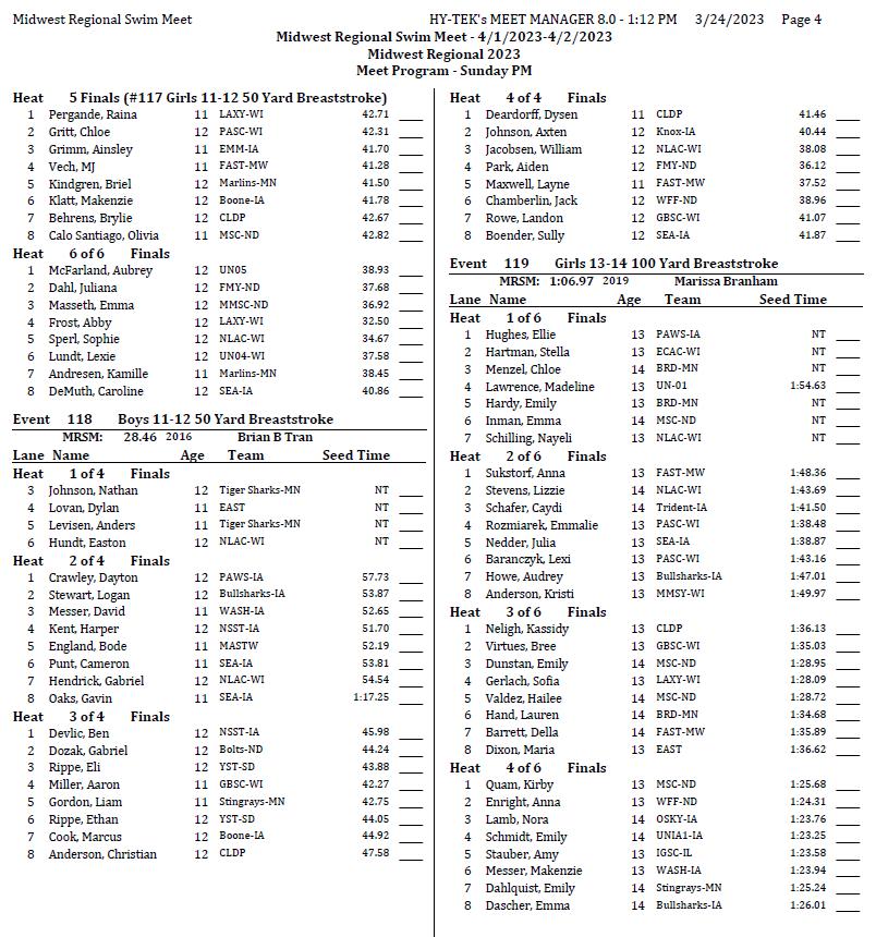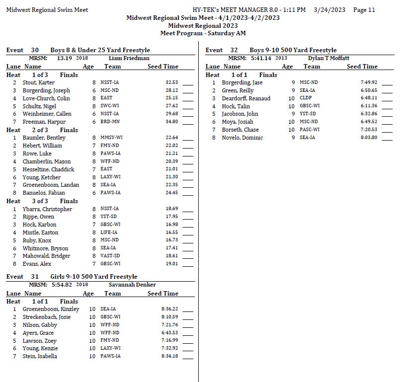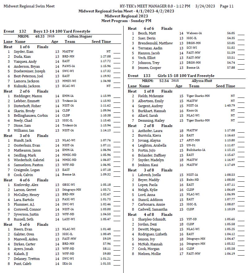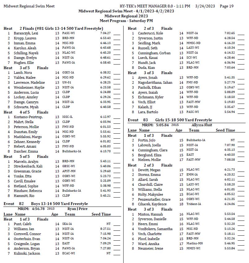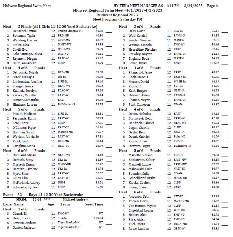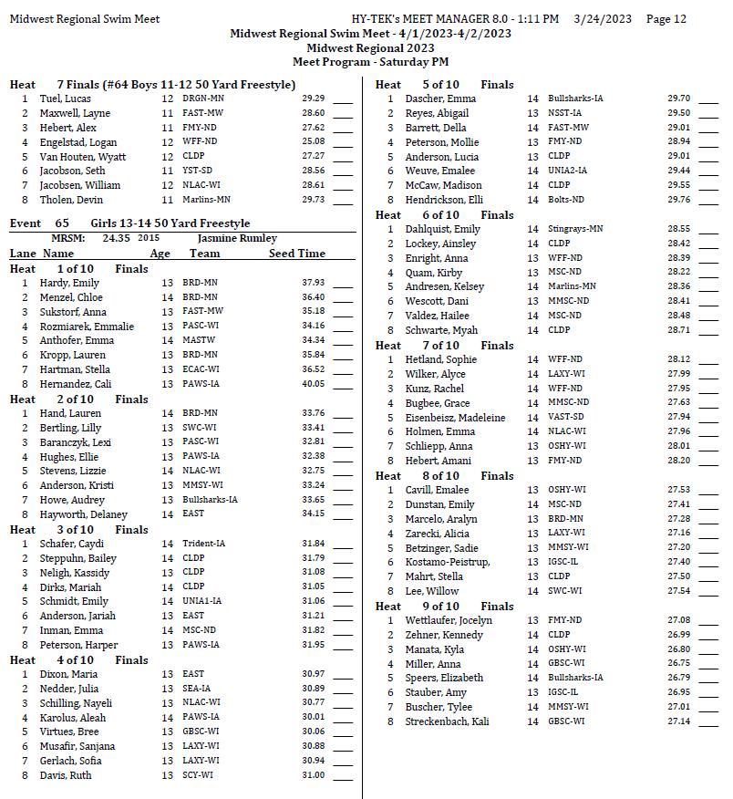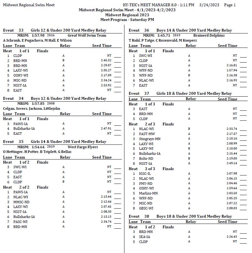 2023 Midwest Regional Swim Meet FULL Schedule - All Sessions