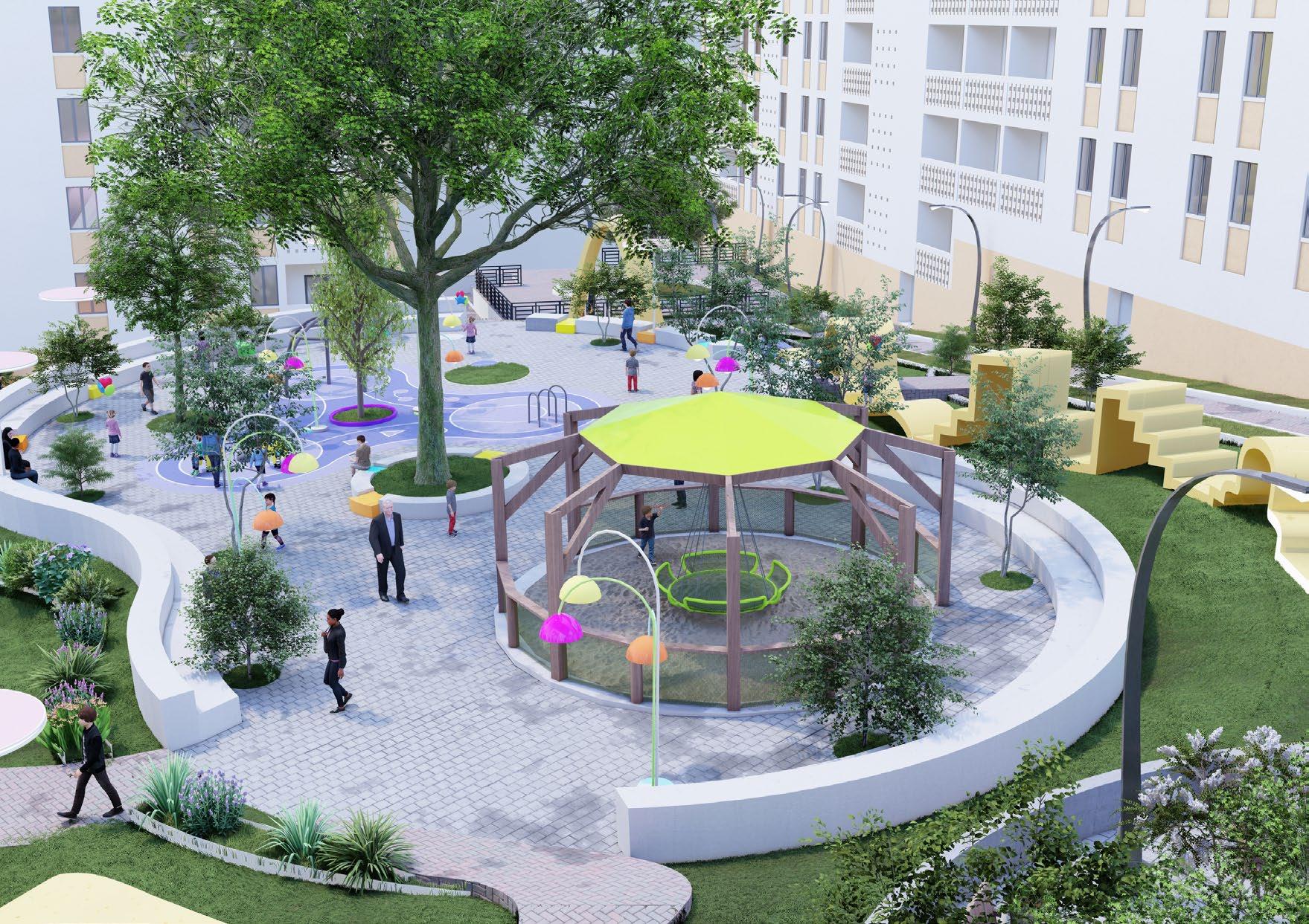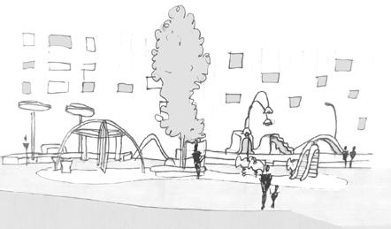 Notre espace public s’inscrit dans le projet urbain de Amir zemour ‘’Sporty concorde’’ qui vise à lier la concorde au restant de la ville par une continuité fonctionnelle, à savoir le sport, à travers des équipements avec un parcours sportif qui relie et prolonge leurs activités. Notre projet, une aire de jeux aux couleurs vives, constitue un nouveau jalon dans la typologie des interventions publiques urbaines à l’échelle du quartier. Quand au site, de par son emplacement au centre de 3 barres d’habitation, et aux qualités d’intimité et de proximité qu’il offre aux usagers, il sera destiné aux enfants et à leurs parents, habitants des 3 barres. Le projet comporte 3 plateformes épousant la pente du terrain : Une aire de jeux pour enfants, aire de loisirs et de jeux de dominos et éspace détente pour les femmes, assurant plus d’intimité.