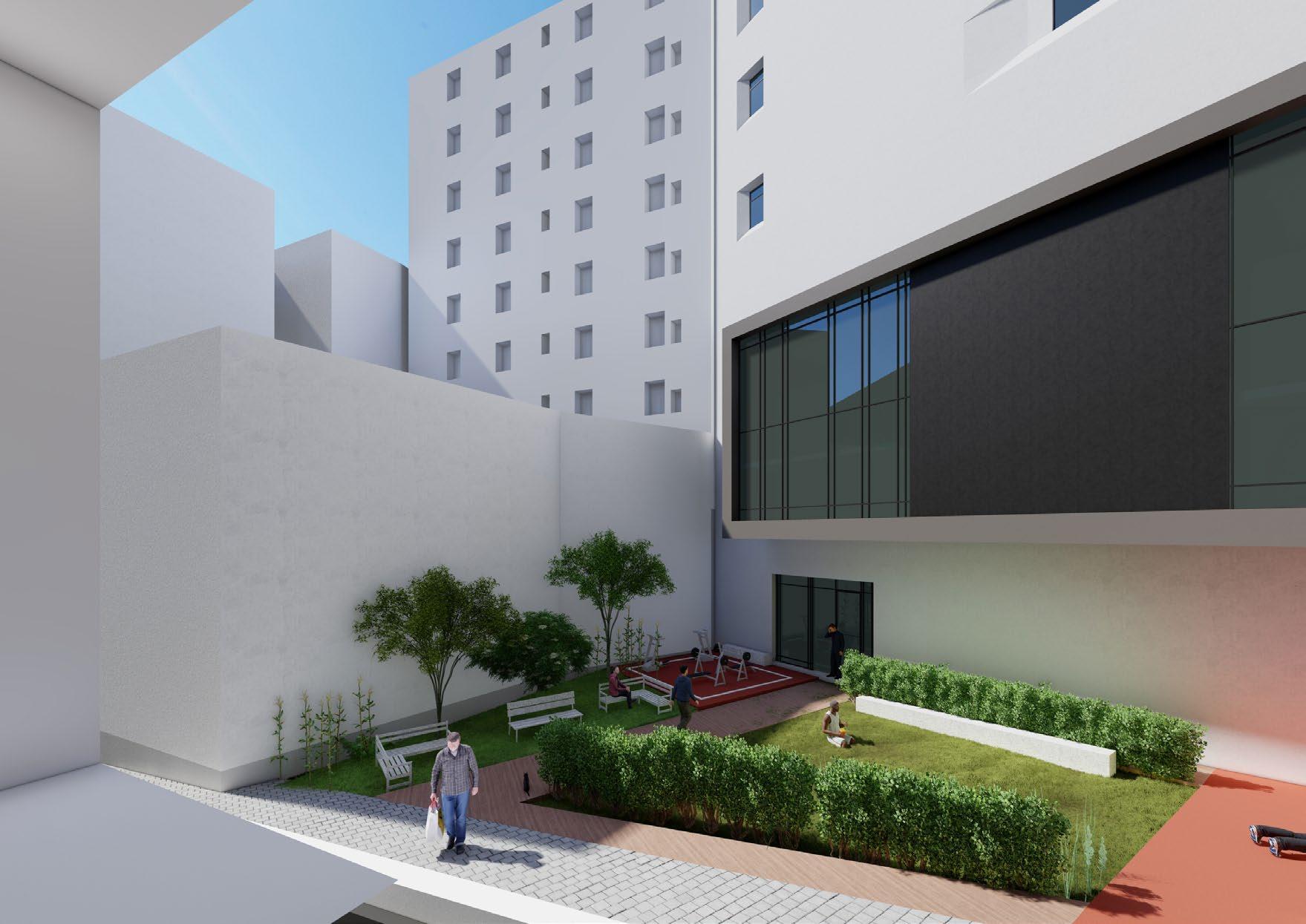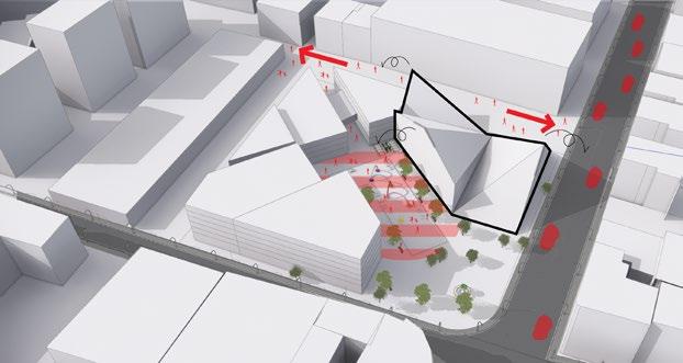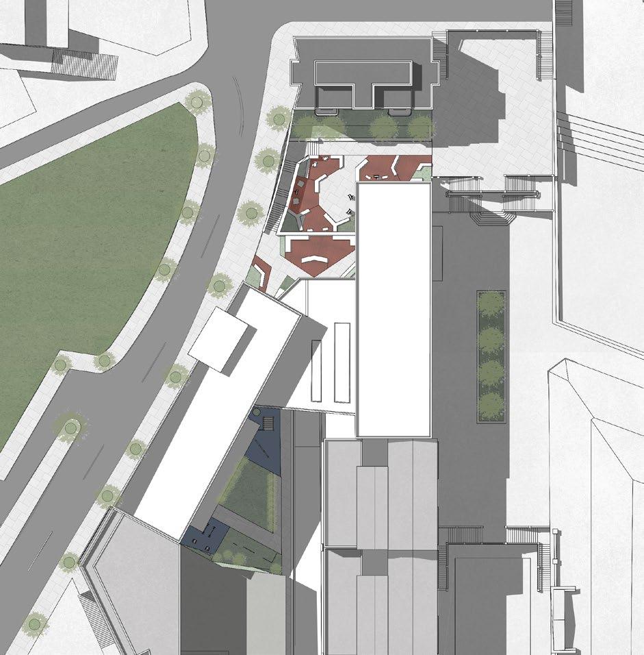 Le tracé est issu par un prolongement de l’espace public à l’intérieur de la parcelle puis en procédant par évidements successif afin de connecter et restituer cet espace collectif à la ville et habiter le centre de l’îlot.
