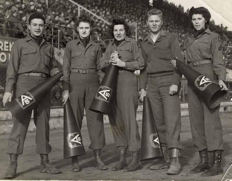 The Wisconsin Veterans Museum houses two separate collections from Milton Sklansky and Eunice Onsrud Hall who served in World War II. Each of their collections includes photographs from the 1945 News Years Day "Spaghetti Bowl," which was a football game between the Fifth Army and the Twelfth Air Force in Florence, Italy. This photo is of the Fifth Army cheer squad featuring several Wisconsin veterans: Milton Sklansky (left), Eunice Onsrud Hall (second from left), and Dorothy Dannies Alexander (third from left.) WVM.0626.I009
