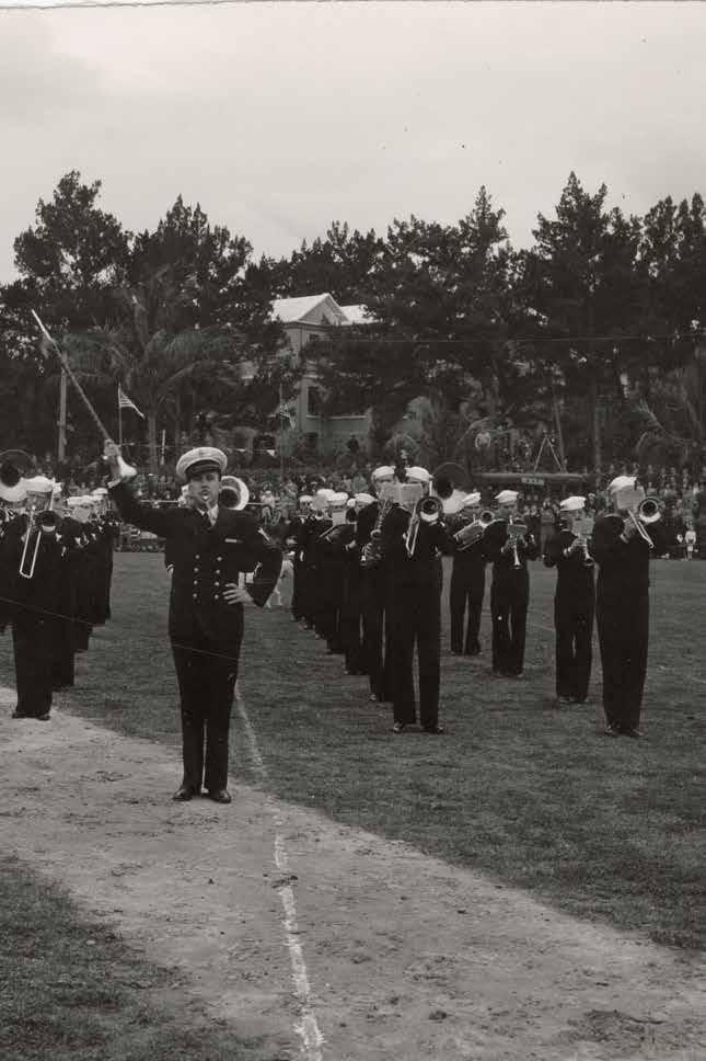 US Navy band playing at the Lily Bowl, an Army-Navy football game that was played in Bermuda in January 1954. Navy would go on to win the game, 39 to 6. Donald J. Cochran, a Madison, Wisconsin resident enlisted in the US Navy in 1942, serving as a photographer’s mate. During his service, he was stationed at the navy air base in Bermuda. He and his wife lived in Iowa and later in Pewaukee, Wisconsin. Donald J. Cochran passed away in July 1992 and is buried in the Wisconsin Memorial Park, Brookfield, Wisconsin. WVM.0938.I112