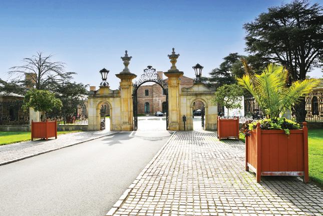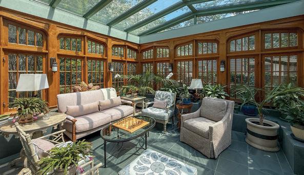 Then there was a new challenge — the couple wanted to have an indoor swimming pool, something that did not exist in Gothic times. They added a handsome, very modern pavilion with a roof pitch that matched the original house. Inside is a “swimming tank” that pumps water past you at a desired speed and you swim, but actually go nowhere! The interior walls of the pool building are decorated with one-inch tiles that range from a blue tile density at the bottom to vivid white at the top. This new pavilion and the renewed Gothic mansion do very well together as a composition.