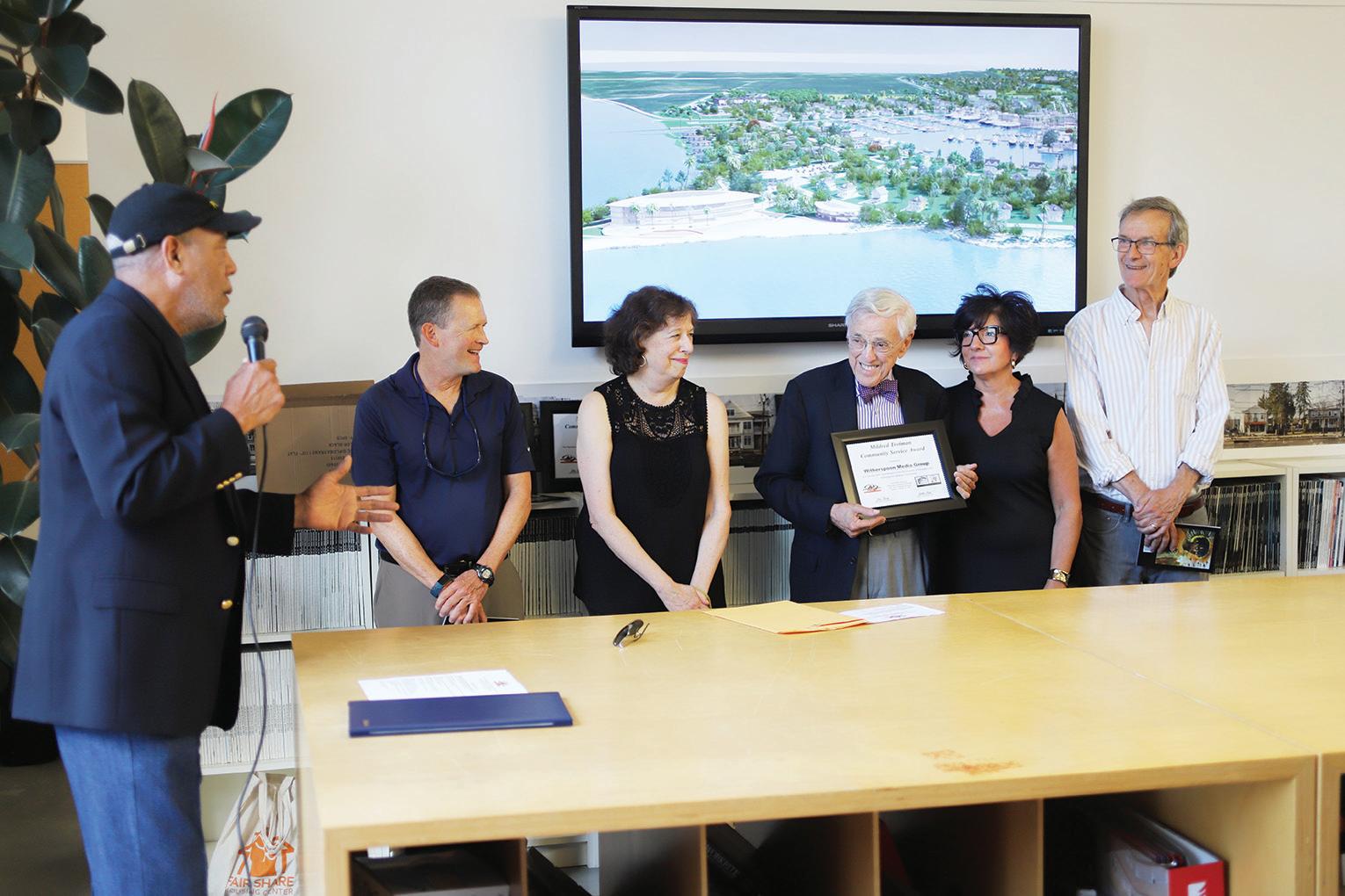 AMONG THE HONORS: Witherspoon Media Group was among the organizations and individuals recognized at the August 1 opening reception for the annual Joint Effort Safe Streets Summer Program, held at the offices of Studio Hillier on Witherspoon Street. From left: Joint Effort Founder and Director John Bailey, Town Topics Sports Editor Bill Alden, Staff Writer Anne Levin, Publisher Bob Hillier, Operations Director Melissa Bilyeu, and Staff Writer Don Gilpin. (Photo by Jeffrey E. Tryon)