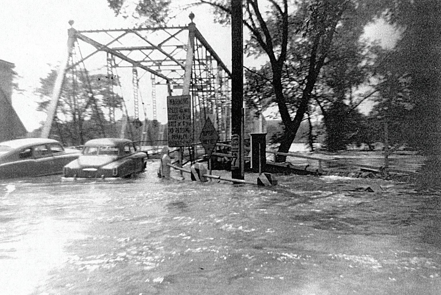 ALMOST GONE: The Yardley-Wilburtha Bridge, still spanning the Delaware River in this shot, was among the casualties of the deadly flood of 1955. Mary Shafer, author of a book on the subject, delivers a talk about the epic event on June 26. (Photo from the Trentoniana Collection)