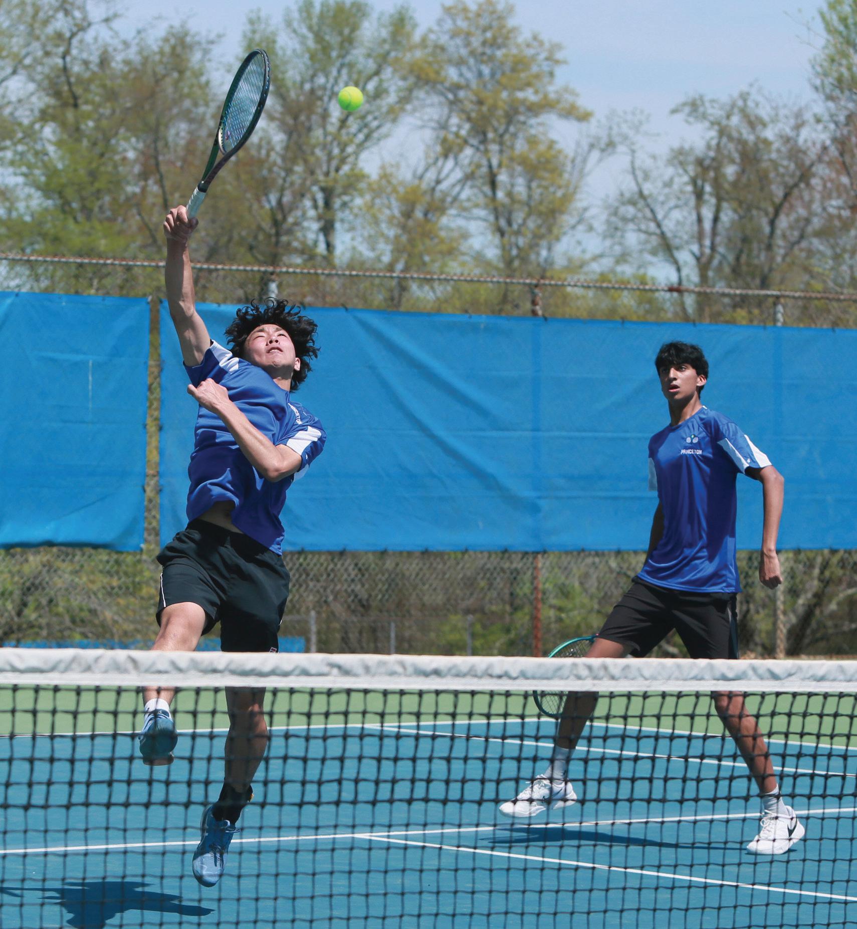 RISING UP: Princeton High boys’ tennis first doubles player Tacto Yamada, left, leaps for a shot in recent action as partner Shaan Zaveri looks on. Last week, sophomore Yamada and senior Zaveri advanced to the semifinal round of the New Jersey State Interscholastic Athletic Association (NJSIAA) boys’ tennis doubles tournament. The PHS pair saw their NJSIAA run end as the WW/P-South duo of Shriyan Kumar and Rohan Ramachadran defeated them 6-0, 6-3 last Thursday at the Mercer County Tennis Complex. (Photo by Frank Wojciechowski)