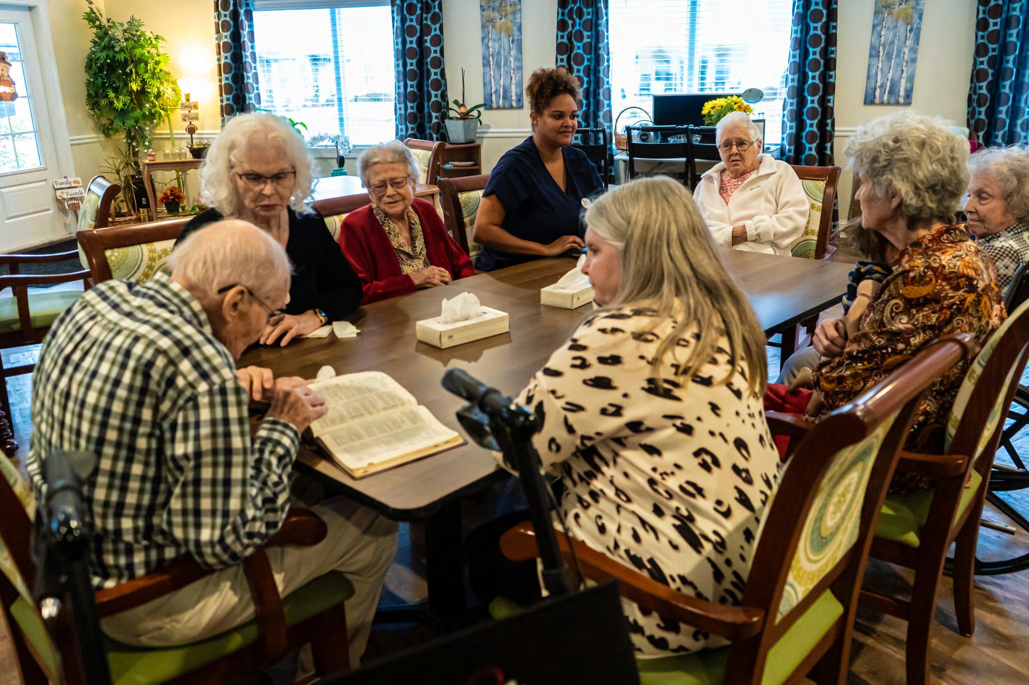 If you visit the large activity room at Lakeside Senior Living, you’ll notice many of the residents’ colorful artistic endeavors that adorn its walls and shelves. An abundance of sunlight fills the room through large windows, and sturdy rocking chairs are just off the back porch, should you be inclined. Every Tuesday at 3 PM, it is in this room that groups of residents gather to study the Bible while listening to a fellow resident expound on his vast knowledge of Scripture.