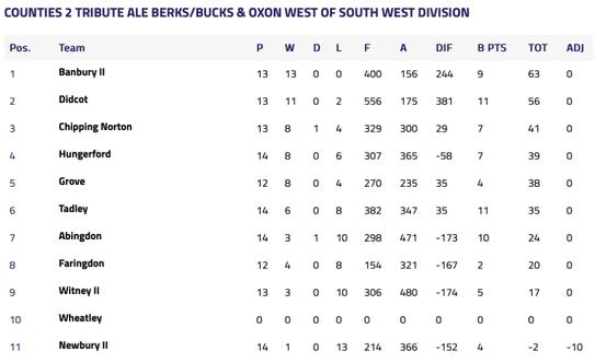 No game to report on but plenty to look forward to. Next up: Beaconsfield — a sterner test, and one that will require a full 60-minute performance. Beaconsfield sit comfortably in 3 , with a 6-point gap there is no chance of displacing them there. Hungerford have leapfrogged us into 4 place and just one-point marks the difference, but with a much better points difference, a bonus point should be enough for us to regain 4 .