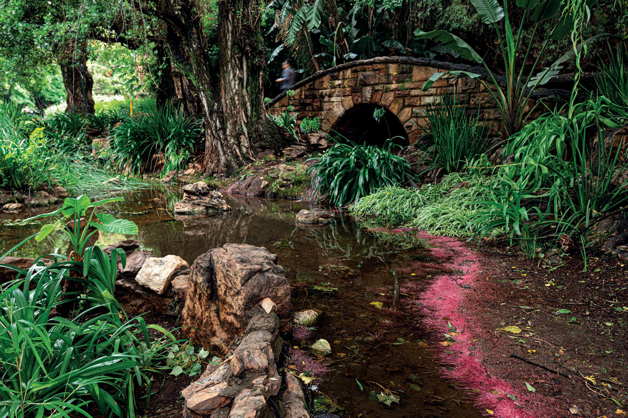 The inset photo above is a souvenir image from the Johannesburg Empire Exhibition in 1936 with an imposing Art Deco clock tower at the top of the ridge. The rock garden beyond the bridge was subsequently transformed into a tropical wonderland with the charming waterfall captivating students and visitors to this day.