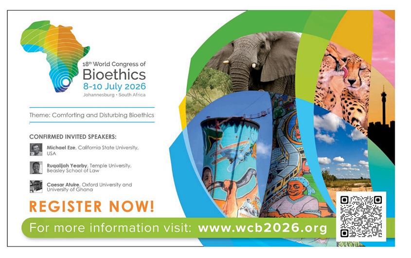 The Steve Biko Centre for Bioethics, in the School of Clinical Medicine, will be the local host of the World Congress of Bioethics (WCB) It will take place at the OR Tambo Conference Centre from 8-10 July 2026. The Centre is supported by leaders in bioethics from Kenya and Ghana, who, together with us, form the Congress Africa Hosting Committee.