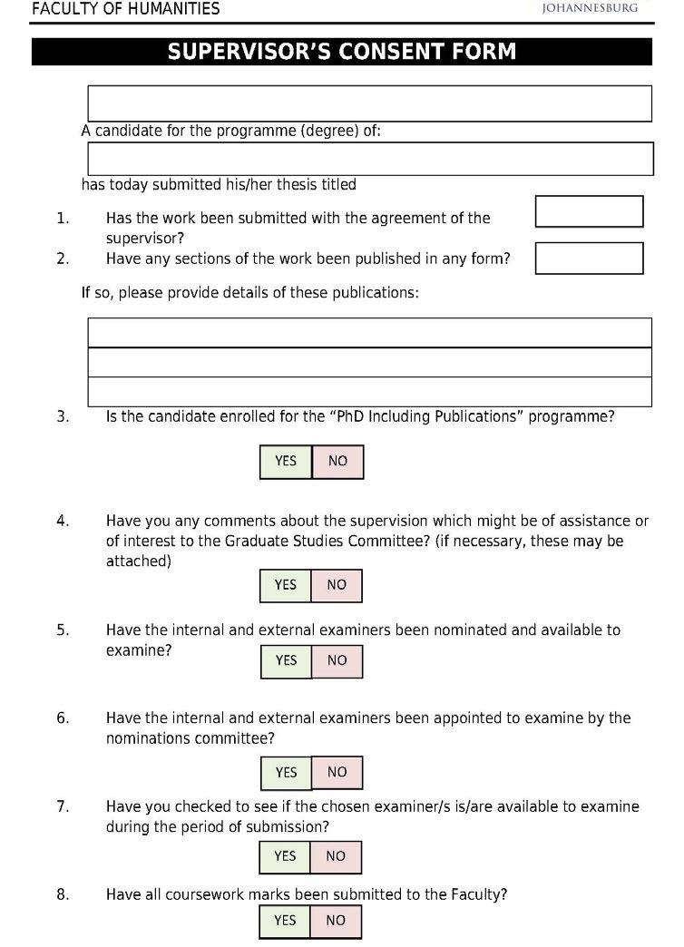 The forms presented here are just to give you a guideline on forms that are needed – please refer to the relevant Faculty Graduate Office website for the most recent version of these forms (only the first page of these forms is shown here) as well as the Ulwazi Fine Art PG courses which presents these.