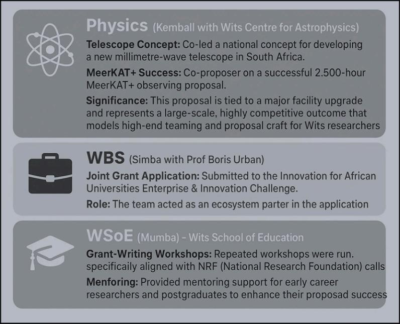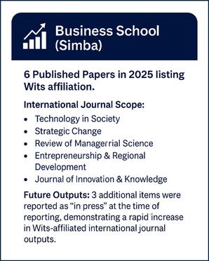 Complementing CDTA, the Carnegie Africa Diaspora Programme continued to forge transformative connections with leading institutions in the Global North and across the continent. Through Distinguished Visiting Fellowships, joint supervision arrangements, high-impact co-authored publications (particularly in Astrophysics and Business Sciences), grant-writing capacity building, and public lectures, the programme has significantly enhanced Wits’ supervision capacity and international research networks. Ongoing collaborations seeded through this initiative promise enduring benefits for both academics and postgraduate students in the years ahead.