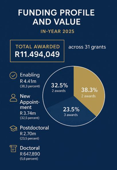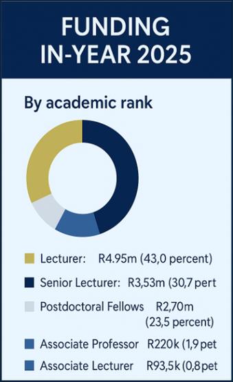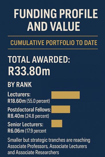 The flagship Carnegie Diversifying the Academy (CDTA) programme invested R11 49 million across 31 grants in 2025, bringing cumulative investment since inception of phase 3 to R33.80 million. Over 55% of total funding has supported Lecturer-level appointments, with substantial portions also directed to Postdoctoral Fellows and Senior Lecturers Active grantees supervised Masters and PhD students during the year, confirming the programme’s role as the University’s primary academic pipeline instrument.