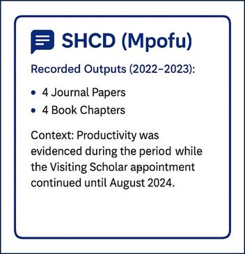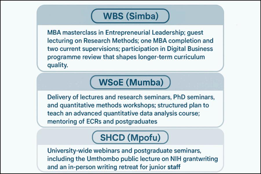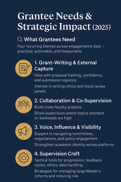 Career milestones included promotions and permanent appointments for, among others, Professor Kagiso Pooe, Dr Khosi Radebe, Dr Matsidiso Sello, and Dr Chia-Yu Chen. The Early- to Mid-Career Academic Transitions (EMCAT) leadership programme supported 27 participants with mentoring, conflict management, portfolio retreats, and public-engagement training, creating what participants called “collegial spaces” that restore purpose and voice Operational refinements of the programme further strengthened trust and efficiency
