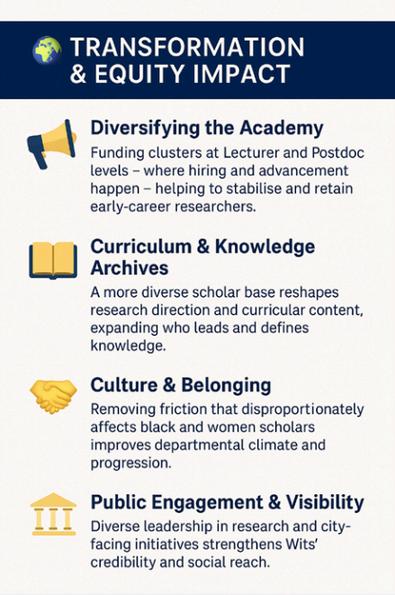 The six Transformation Pillars now constitute the organising framework for all equity and inclusion work at Wits The trajectory has shifted from historical redress and compliance toward proactive advocacy, inclusive institutional cultures, language justice, Global South-centred knowledge production, and purposeful public engagement.