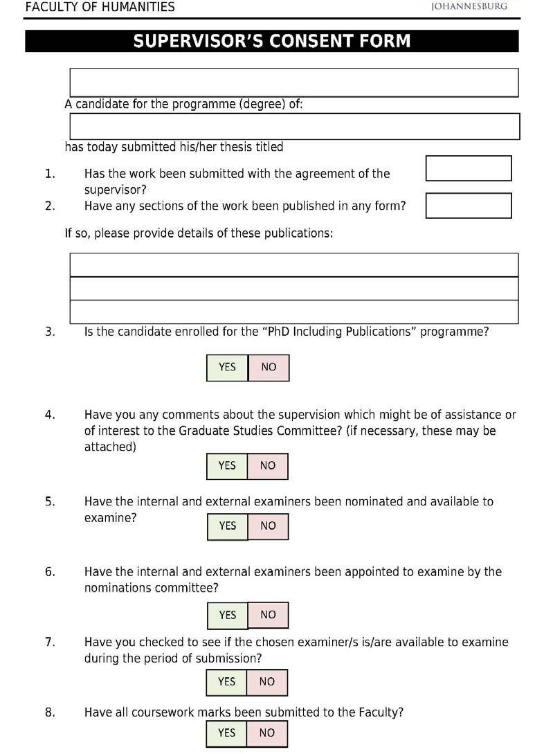 Supervisor to fill in the form giving consent to Faculty that the students work can be submitted for examination