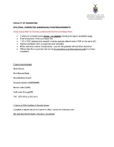 Payments to the University can be made in the form of a bank draft issued in South African currency of “ZAR” and made payable to the University of the W itwatersrand, Johannesburg, or by electronic transfer.