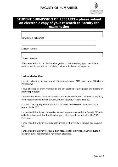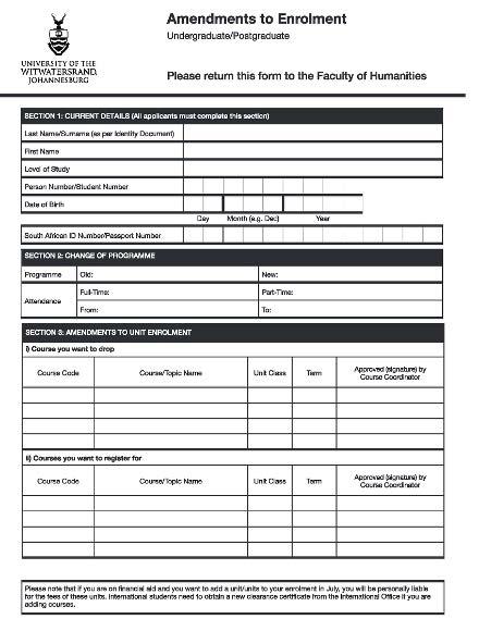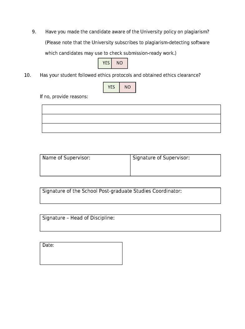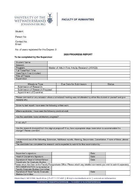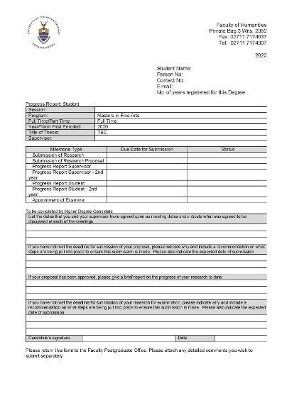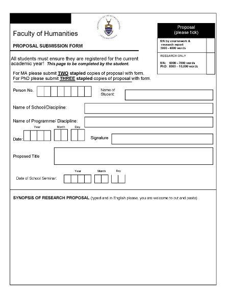 The forms presented here are just to give you a guideline on forms that are needed – please refer to the relevant Faculty Graduate Office website for the most recent version of these for ms (only the first page of these for ms is shown here) as well as the Ulwazi Fine Art PG courses which presents these.