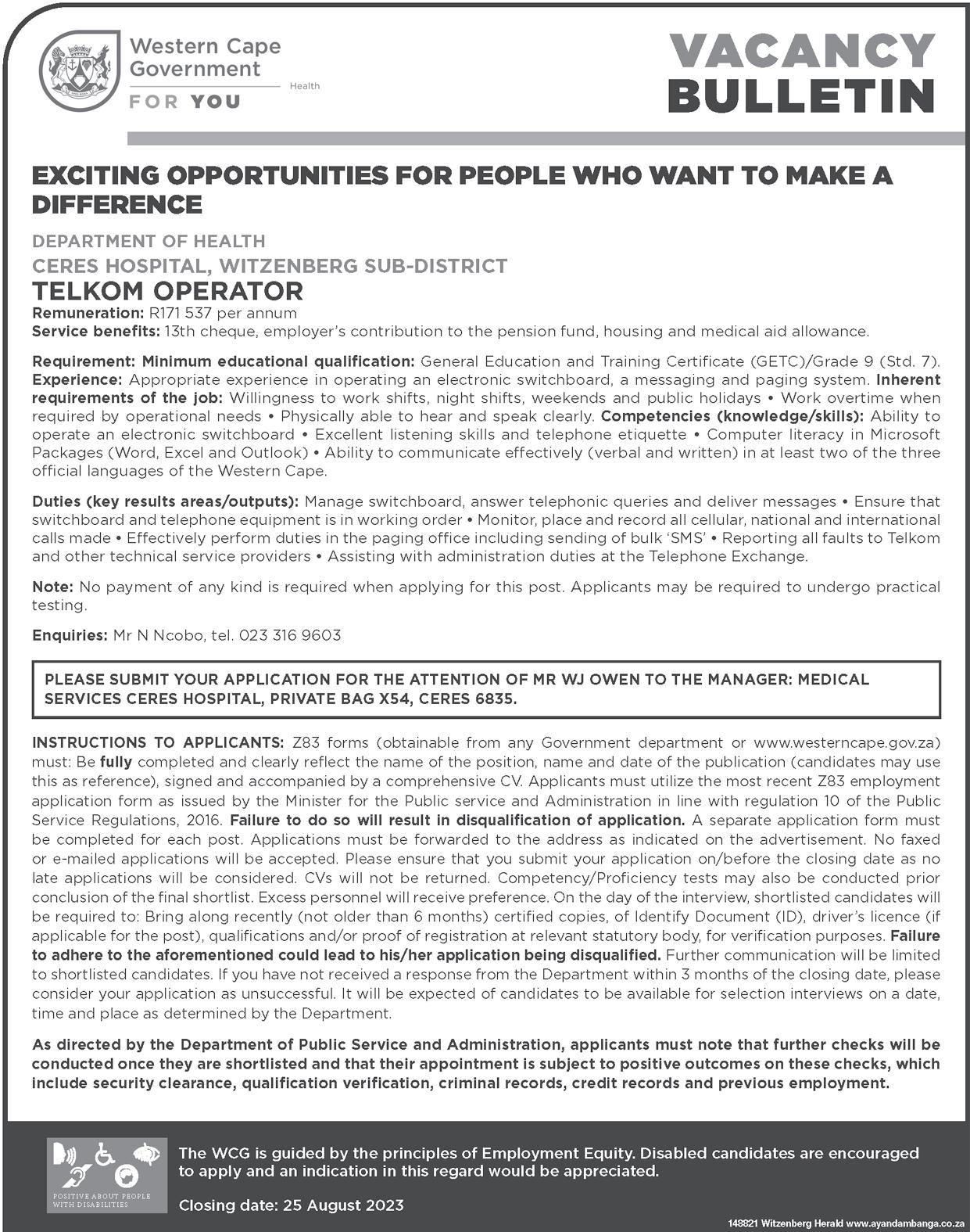 Die geskikte kandidaat beskik or minstens Gr. 12, goeie ondervinding van die MS Office-program, veral Word en Excel en die vermoë om goeie menseverhoudinge te handhaaf.