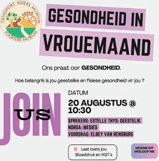 ELKE jaar word die sterk vroue wat in 1956 teen diskriminerende en onregverdige vroueregte in opstand gekom het, onthou. Die Openbare Opvoeding en Uitreikingsafdeling het Vrouemaand herdenkingsprogramme aangebied as ‘n blyk van waardering vir die vroue se moeitelose bydraes tot huishoudings, gemeenskappe en die samelewing in geheel. Op Dinsdag 6 Augustus is die eerste program in die Tulbagh stadsaal aangebied, met vroue van die Christelike Vroue Netwerk op Saron, Gouda, Hermon en Tulbagh. Bethmery Cloete (openbare opvoeding en uitreikingsbeampte), het ‘n opvoedkundige sessie oor die belangrikheid van die bevordering van Vroueregte aangebied. Op Woensdag 7 Augustus is ‘n tweede Vrouemaand herdenkingsprogram in Ceres stadsaal aangebied vir vroue op Ceres en in Bella Vista en Nduli. Tydens die geleentheid het rdl. Dirk Swart ‘n boodskap van bemoediging en waardering met die vroue gedeel oor hul unieke rol en invloed in die samelewing. Wendy Kaizer-Philander het ook ‘n toespraak gelewer.