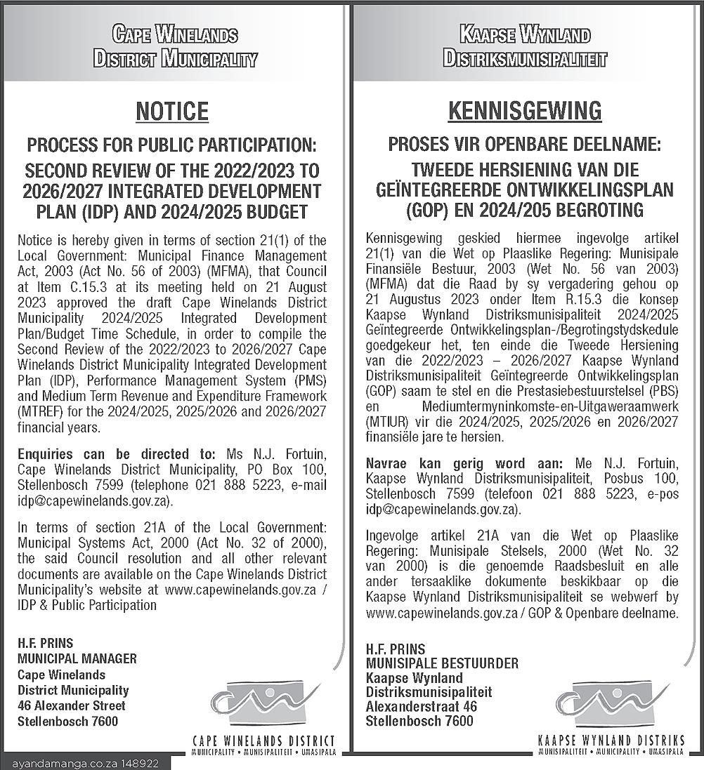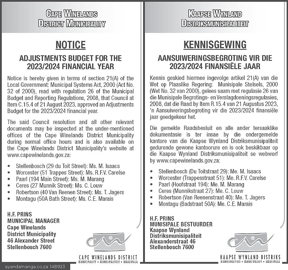 Kennis geskied hiermee dat die aansoek hierna uiteengesit nou ter insae lê gedurende normale kantoorure in die kantoor van die Munisipale Bestuurder. Alle navrae moet aan die aansoeker gerig word. Besware en kommentaar, indien enige, moet skriftelik aan die Munisipale Bestuurder gerig word by Posbus 44, Ceres 6835 of Voortrekkerstraat 50, om hom te bereik nie later as die aangewese sluitingsdatum van die saak nie.