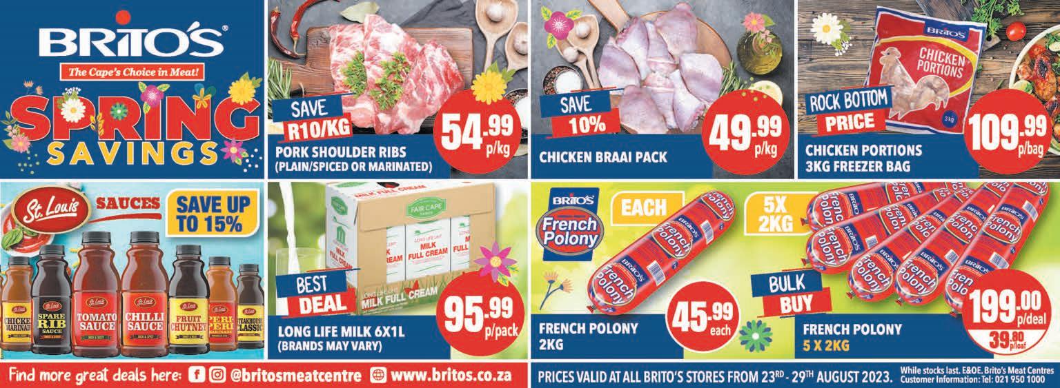 NIE TE KOOP AAN PERSONE ONDER DIE OUDERDOM VAN 18. GENIET VERANTWOORDELIK. CERES SUPERSPAR (023) 316-2226 SUPERSPAR BUSINESS HOURS: Mon - Sun 07:00 - 19:00 TOPS: BUSINESS HOURS: Mon - Fri 09:00 - 19:00 Sat 09:00 - 17:00 ONLY AVAILABLE AT CERES SPAR FROM 24 - 27 AUGUST 2023 OR WHILE STOCKS LAST. VAT INCL. NO DEALERS. ERRORS AND OMISSIONS EXCL. Foccacia peppers Spar vacuum pack cheese 700g 2.5kg Spar Refined White Sugar Simba Potato Chips 120g Pro-Wash Fabric Softener 500ml Whole & ½ Lamb Pantene Shampoo or Conditioner 360ml / 400ml ass. Bokomo Weetbix 900g Bulk Rump steak Royco Soup packets ass. 50g Ceres Spar bulk Boerewors 8999p/combo SERVING SUGGESTION Flora Regular or Light Fat spread tub 1kg Protex hygiene soap 150g ass. Whole Chicken + 6 rolls Spatchcock Chicken 4kg Omo Auto washing powder Spar 2-ply Toilet rolls 350 sheet, 18’s Castle Lite Cans 6 x 410ml 2499 5299 each Wortels 750g Aartappels 7kg Koolkop, Uie 1kg Patats 1kg PER COMBO 12000 Nivea Roll on 50ml 1399 each Nescafé Classic Coffee Jar (Incl. refill pouch 230g) 200g 11499 p/kg 9499 p/kg 13999 p/kg 4999 p/kg Klipdrift Export 750ml 14999750ml Wild Africa Liquer 750ml 11499 750ml BUY 2 FOR 15000 Grant’s Whiskey 750ml 19999 750ml 10999 1999 each 12499 each 4699 2 FOR 4500 7999 5999 each 3 FOR 4400 6499 each 8999 each 4 FOR 1800 Futurelife Smart Food, Zero ranges 500g 3699 each
