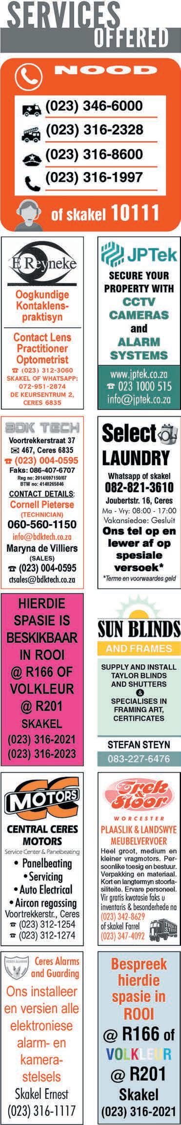 Telephone: (023) 316-2021 Whatsapp: 066-316-3003 Editorial: nuus@witzenbergherald.com Advertising: erika@witzenbergherald.com www.witzenbergherald.com