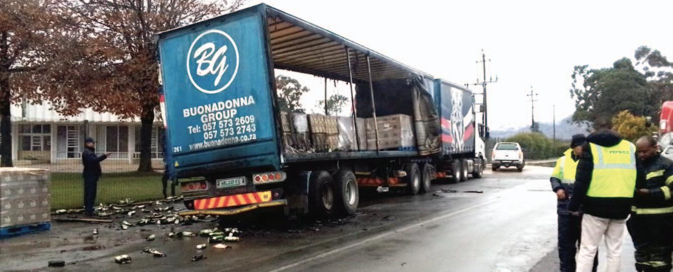 ‘n VRAGMOTOR van die Buonadonna Groep wat Maandagoggend 15 Julie met ‘n vrag appelsap op pad was na Ceres Fruit Juices, se remme het vermoedelik aan die brand geslaan waarna die helfte van die vrag verwoes is. Die voorval het omstreeks 07:50 voor CFG se hoofkantoor in Bon Chretienstraat plaasgevind. Niemand is beseer nie en die brand is vinnig geblus. Die vrag appelsap was van die RBI Wadeville fabriek na Ceres onderweg en sou minute later afgelaai word op die perseel.
