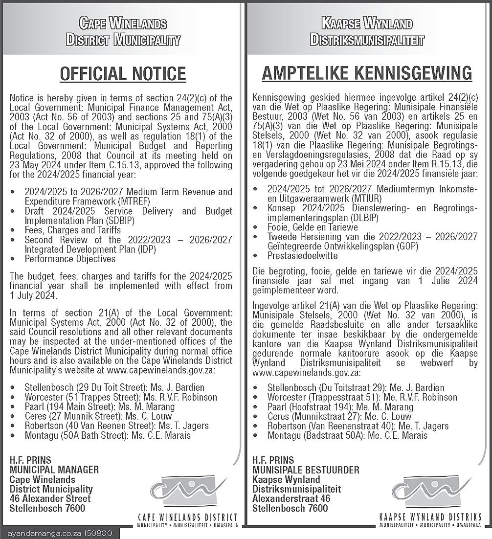Sluitingsdatum van aansoeke: 14 Junie 2024