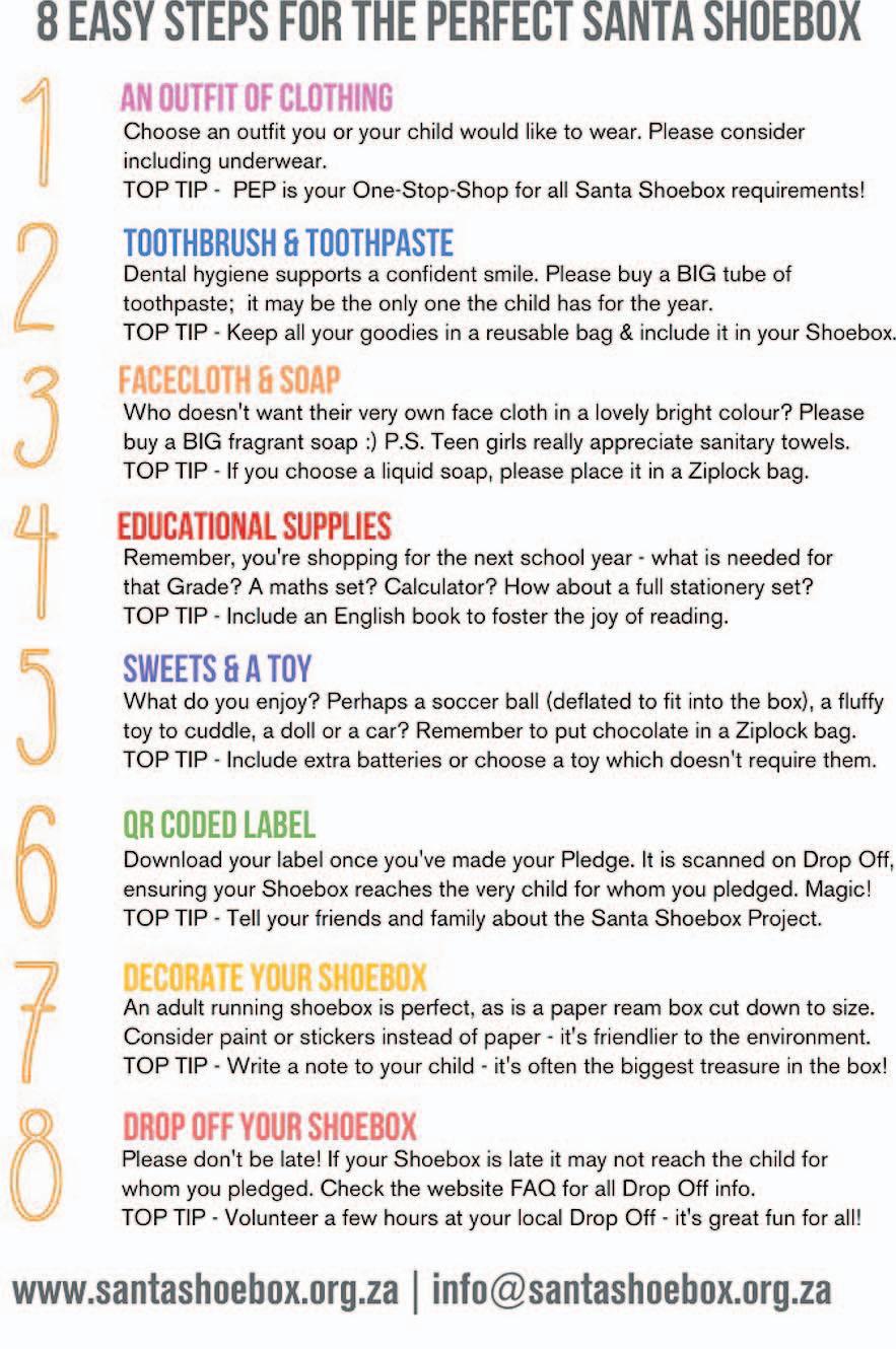 Indien enige sakeonderneming of individu ook hul steun aan hierdie verdienstelike projek wil verleen, kan hulle in verbinding tree met Sarah-Jane du Plessis by 084580-4884 of direk op die webtuiste loerwww.santashoebox.org.za Gaan registreer en kies jou eie kinders vir wie jy persoonlik ‘n boks opmaak!