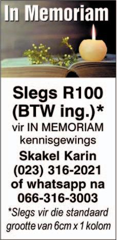 Skakel Karin ☎ (023) 316-2021 info@witzenbergherald.com 066-316-3003 (Slegs Whatsapp)