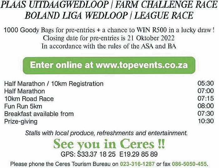 DIE jaarlikse Ceres Michellspas halfmarathon asook 10km en 5km padwedlope, word weer op Saterdag 29 Oktober 2022 aangebied. Deelnemers kan nog inskryf nadat die wedloop die afgelope twee jaar weens CV-19, nie aangebied is nie. Die plaas/maatskappy kompetisie oor 10km is ook weer oop. Enige navrae kan aan Nico Jansen by 078-8825-299 gerig word.