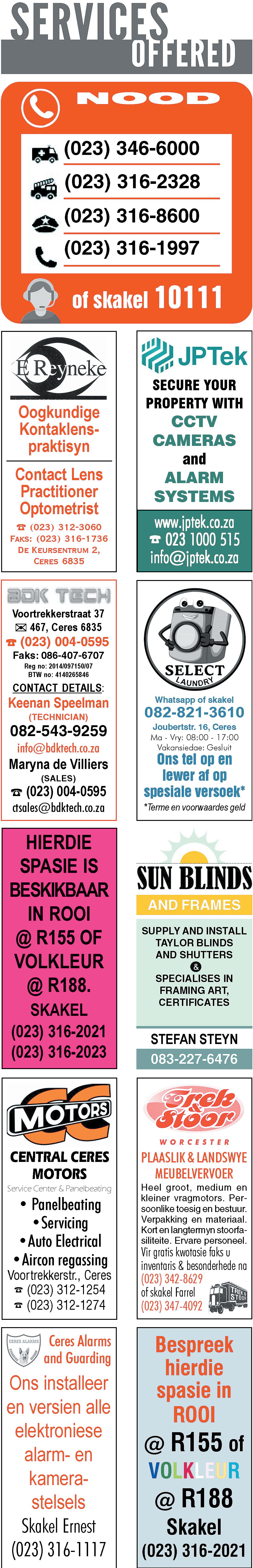 WITZENBERG HERALD Friday, October 28, 20226 classifieds Skakel Karin ☎ (023) 316-2021 info@witzenbergherald.com 066-316-3003 (Slegs Whatsapp) Bondels