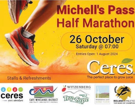 DIE jaarlikse Ceres Michellspas halfmaraton asook ‘n 10 km en 5 km pretloop, word op Saterdag 26 Oktober aangebied. Inskrywings is nou oop vir die plaas- en maatskappy-kompetisie oor 10 km. Inskrywings en navrae kan gerig word aan Nico Jansen by 078-8825-299