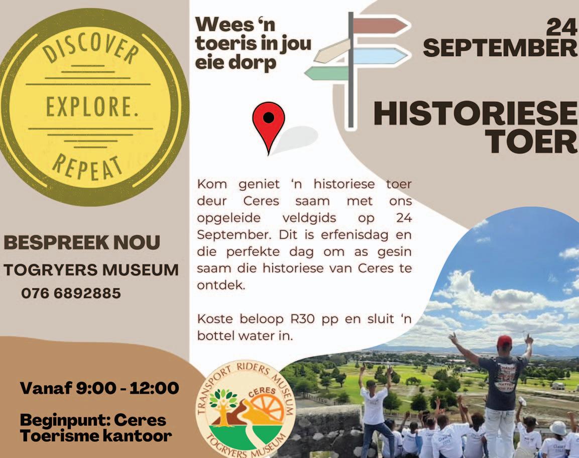● Guided Historical Walking tour for the public on Tuesday 24 September from 09:00to 12:00 @ R30 per person. Bookings via Ceres Togryers museum at (023) 312-2045 or send an e-mail to togryersmuseum@gmail.com