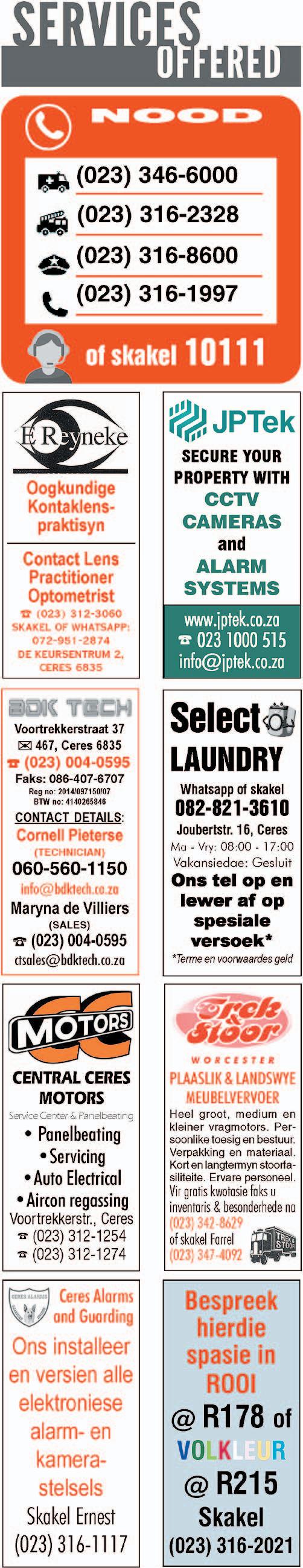 Die Witzenberg Herald word uitgegee vir die eienaars, Snyman, Voortrekkerstraat 17D, Ceres en gedruk deur Novus Print, Lynxstraat 5, Paarden Eiland. Geen advertensie/redaksionele materiaal mag sonder die verlof van die eienaars volgens Art. 12 (7) Wet op Outeursreg 1978 gereproduseer word nie.