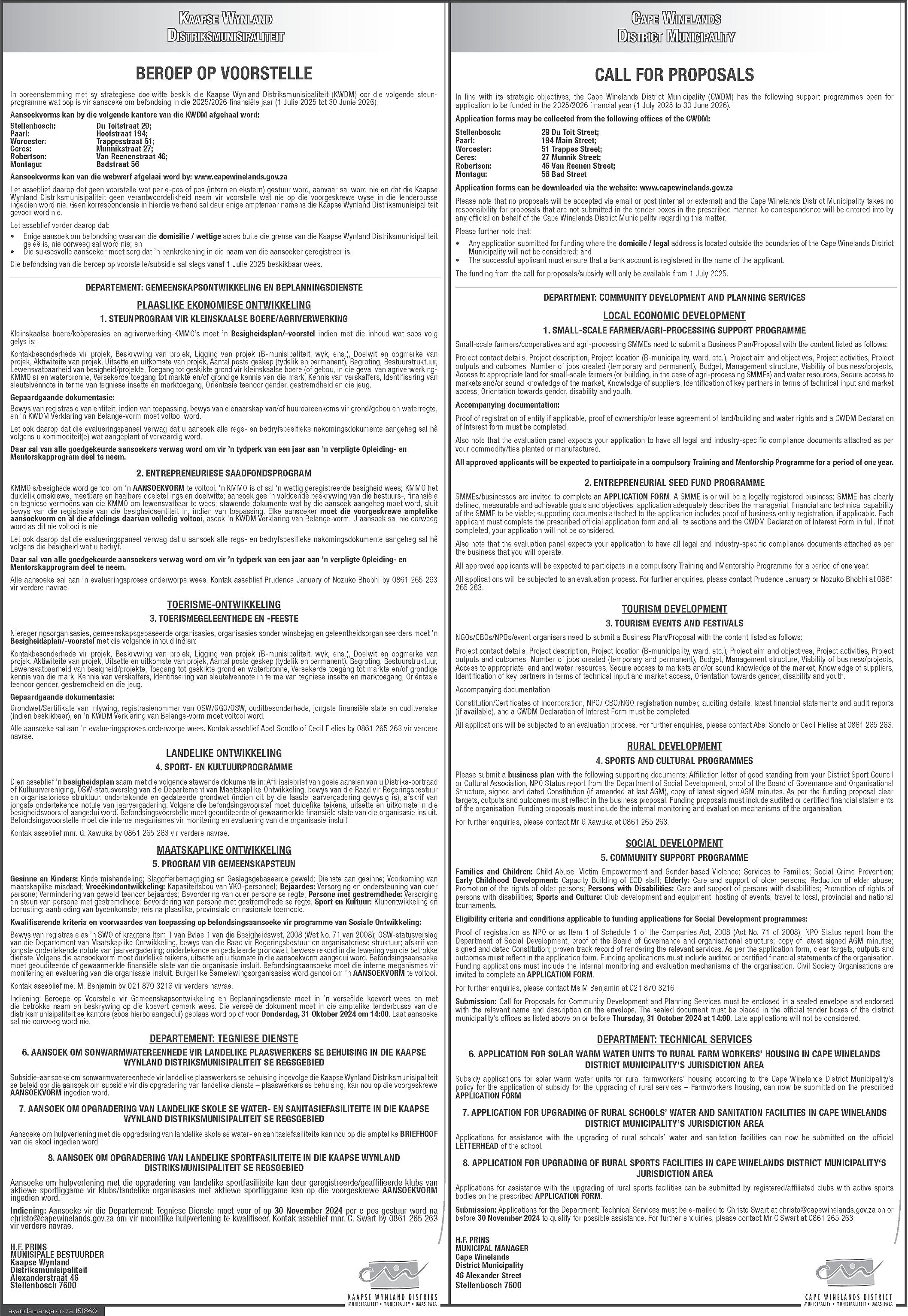 Notice is hereby given that in terms of Council’s Strategic Process Plan, there will now be embarked upon a round of public participation meetings in order to assemble the inputs from the community in respect of the Review 2025/2026 IDP and Budget.