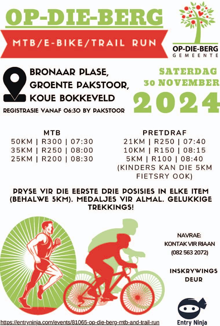 DIE jaarlikse Ceres Michellspas halfmarathon asook ‘n 10 km en 5 km pretloop, word op Saterdag 26 Oktober aangebied. Inskrywings is nou oop vir die plaas- en maatskappy-kompetisie oor 10 km. Inskrywings en navrae kan gerig word aan Nico Jansen by 078-8825-299