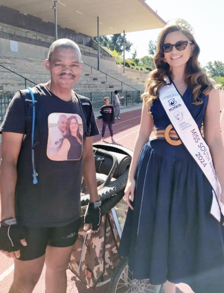 DOLFIE Nel, bekende inwoner van Ceres het onlangs met sy fiets en sleepwaentjie ‘n kort toer vanaf Ceres na Outshoorn onderneem ter voorbereiding van sy solo fietstoer na Namibië. Een van die hoogtepunte van die toer, was sy ontmoeting op Outshoorn met die nuwe Mej. Suid-Afrika, Mia le Roux. Dolfie moes egter terugkeer na goeie vriend, Nicky Koopman, verlede naweek skielik gesterf het. Dolf hoop om Maandag 30 September reg te wees om die fietstoer na Namibië aan te pak.