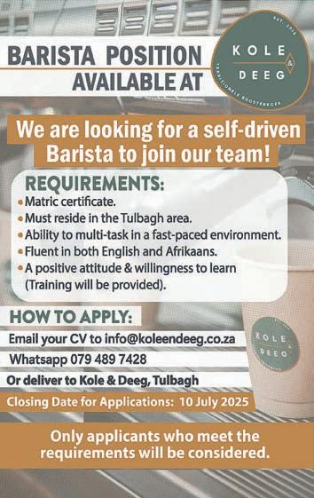 Belangstellendes kan hulle CV stuur vir oorweging aan: lindie@kalos.co.za
