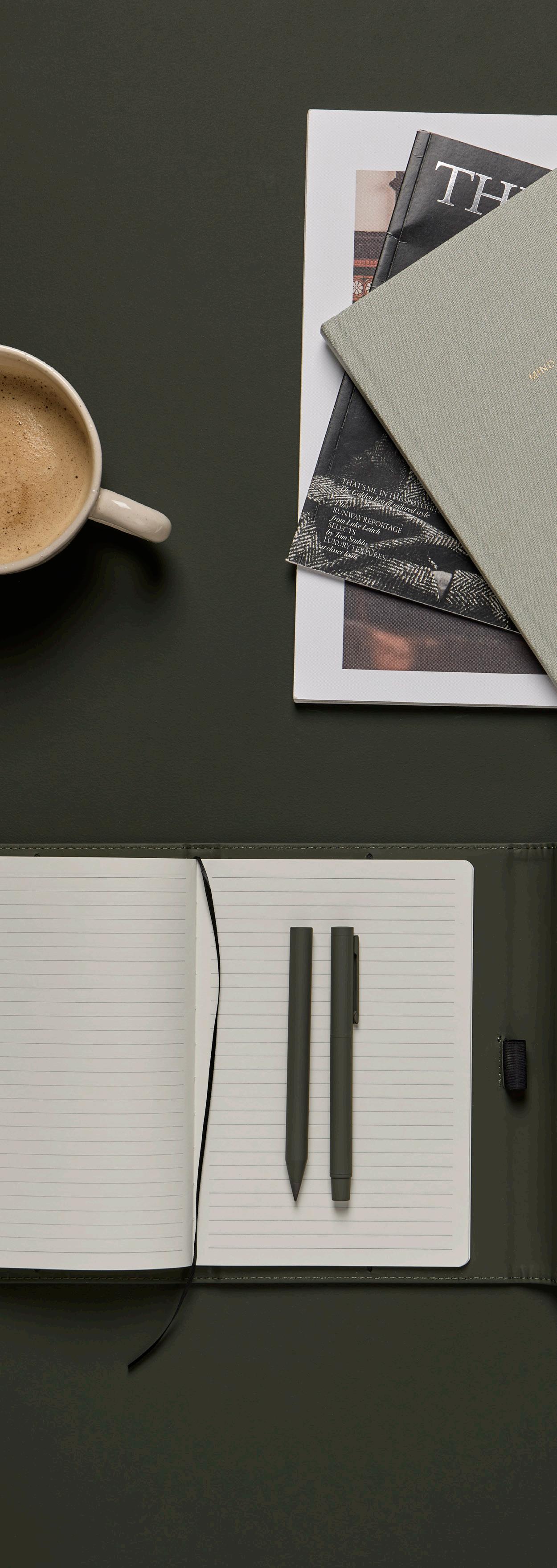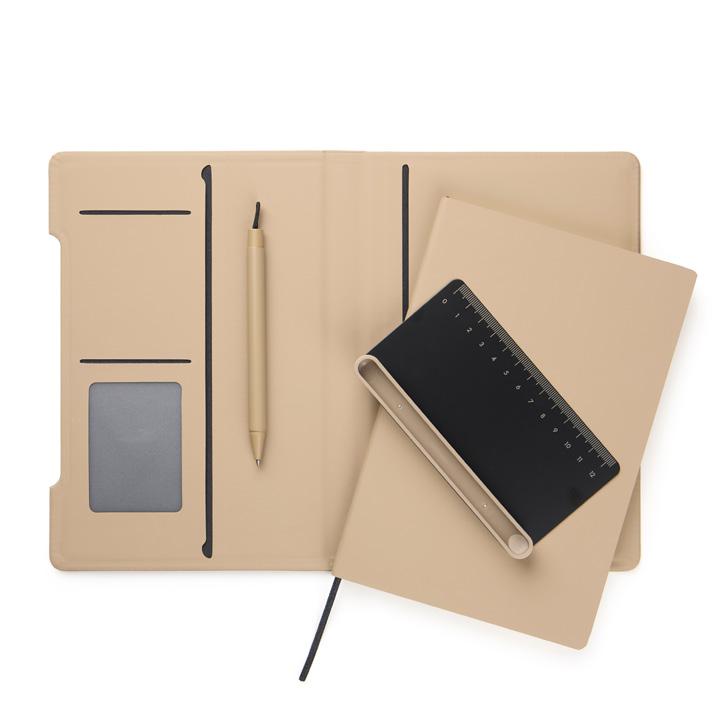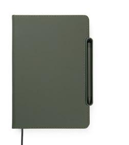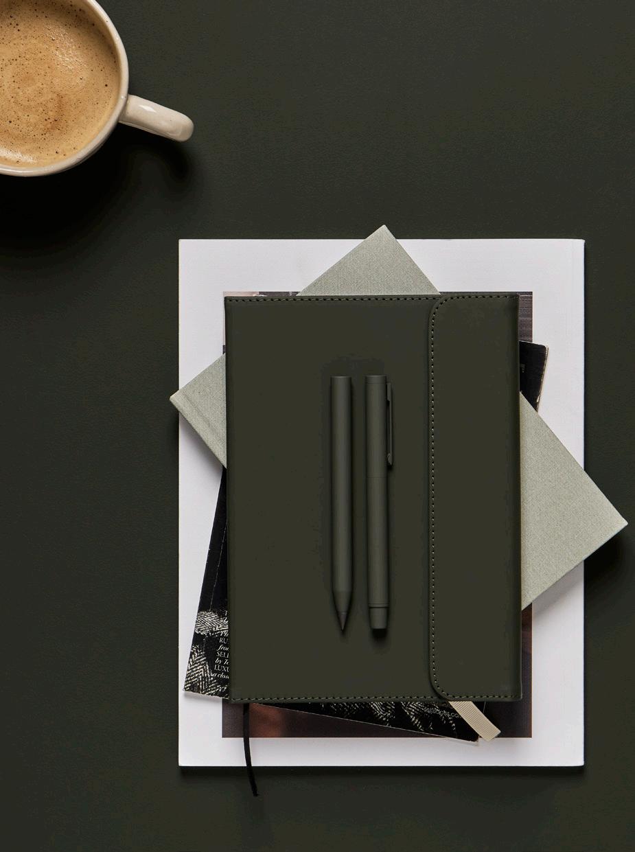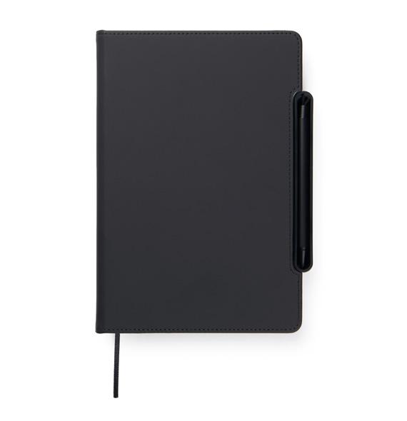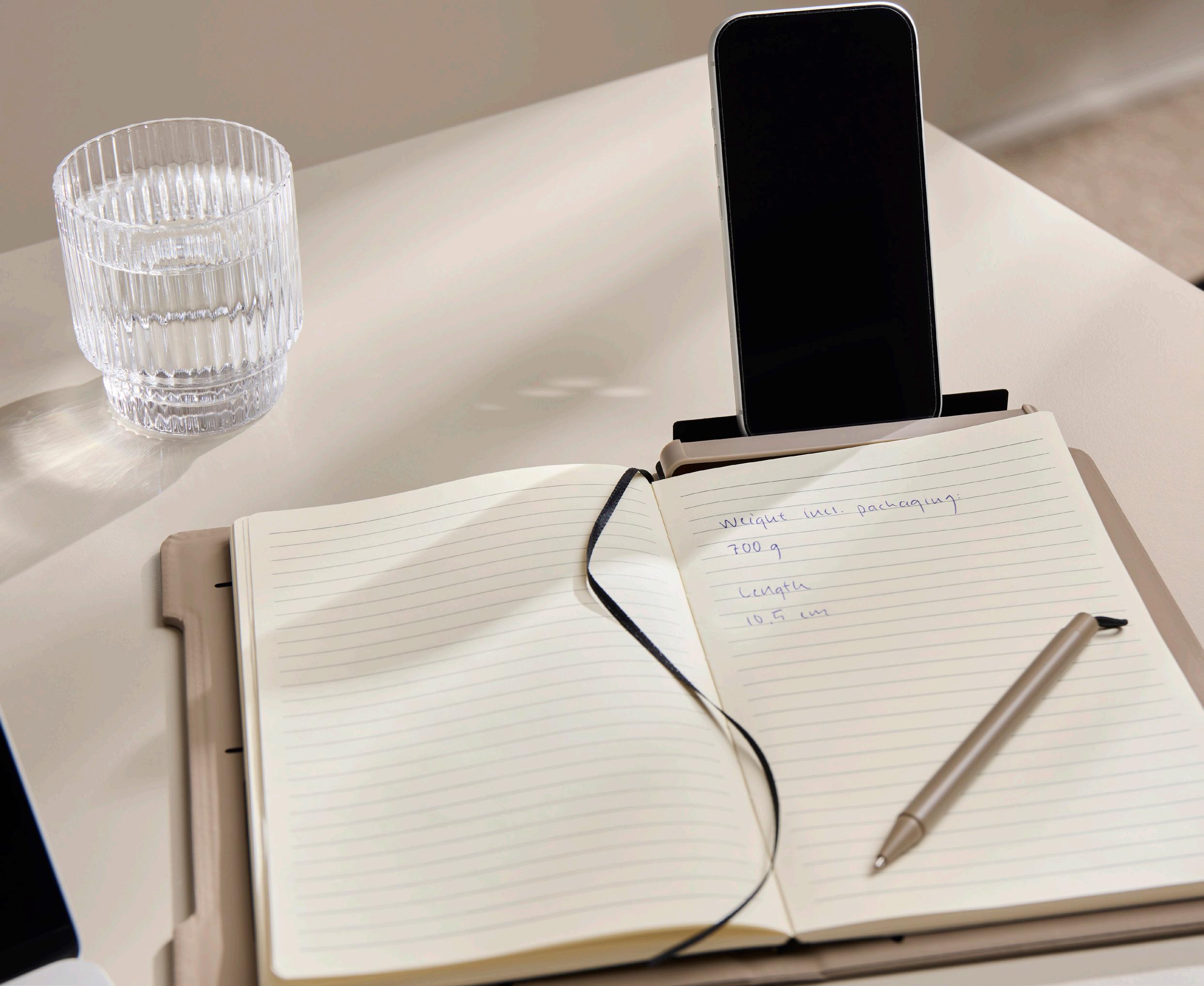 Innebygget holder til telefonen • Med pennholder • 160 sider • Notablokk cover med mulighet for refill • Skrivesett for ledere
